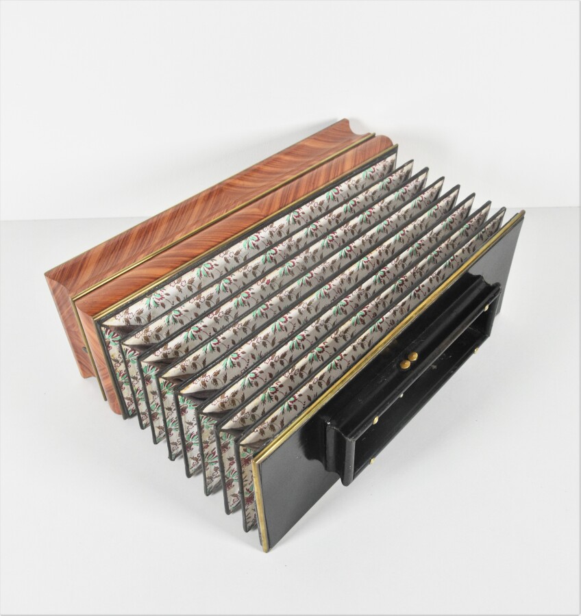 Accordéon diatonique de forme rectangulaire en placage de bois de rose et bois noirci agrémenté de filets de cuivre et de boutons en nacre, décoré de deux têtes de loups en bronze, époque Napoléon III, L. 40.5 cm (soufflet en bon état, légers accidents aux touches).