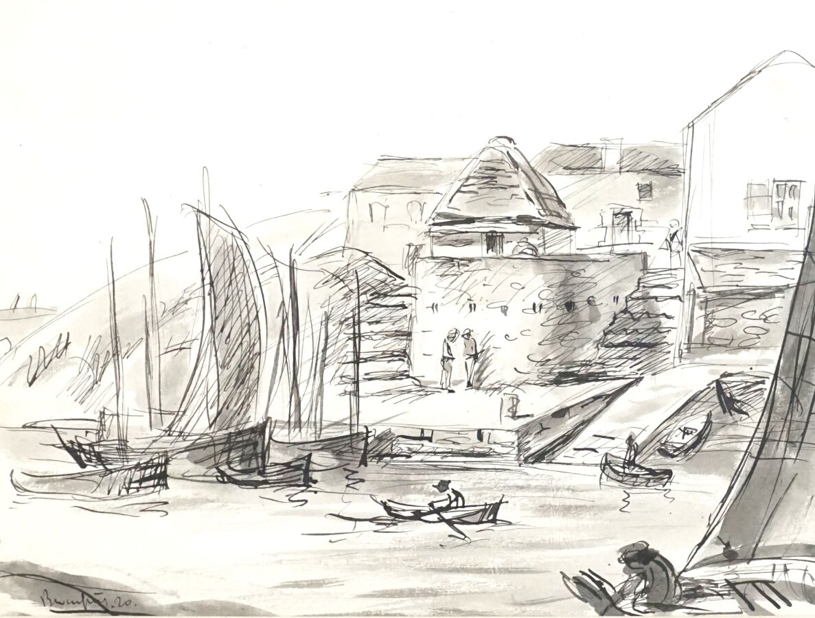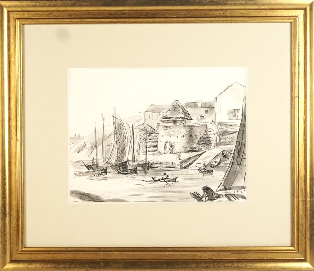 Adolphe-Marie BEAUFRERE (1876-1960), "Le port de Doëlan" 1920, dessin à l'encre et lavis d'encre, signée et datée en bas à gauche, 20,5 x 28 cm (à vue).