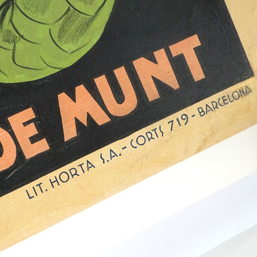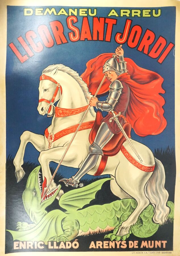 Affiche publicitaire entoilée "Licor Sant Jordi" figurant Saint-George terrassant le dragon, impr. HORTA SA CARTS BARCELONE, présenté en étui d'origine, 110 x 77 cm (petites traces).