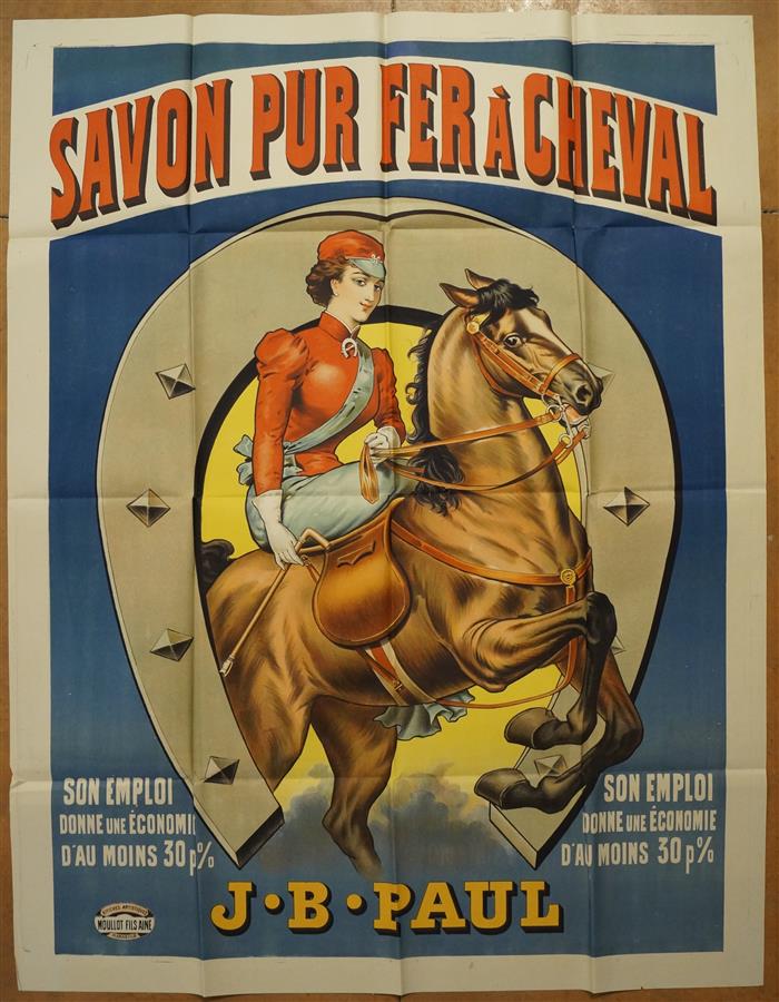 [AFFICHE] - Savon pur fer à cheval J. B. Paul - Marseille ; Affiches artistiques Moullot fils aîné, sans date [fin XIXème siècle] - Affiche lithographiée en couleurs - 144,50x112 cm - 1 déchirure en son milieu sans perte, 1 petite déchirure à 1 pliure sinon parfait état - Couleurs très vives, rare.