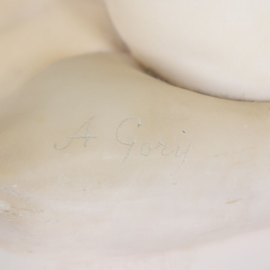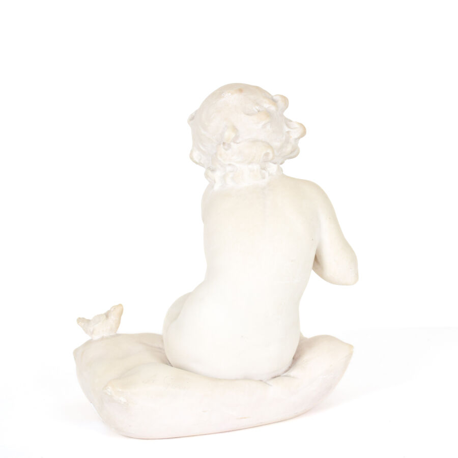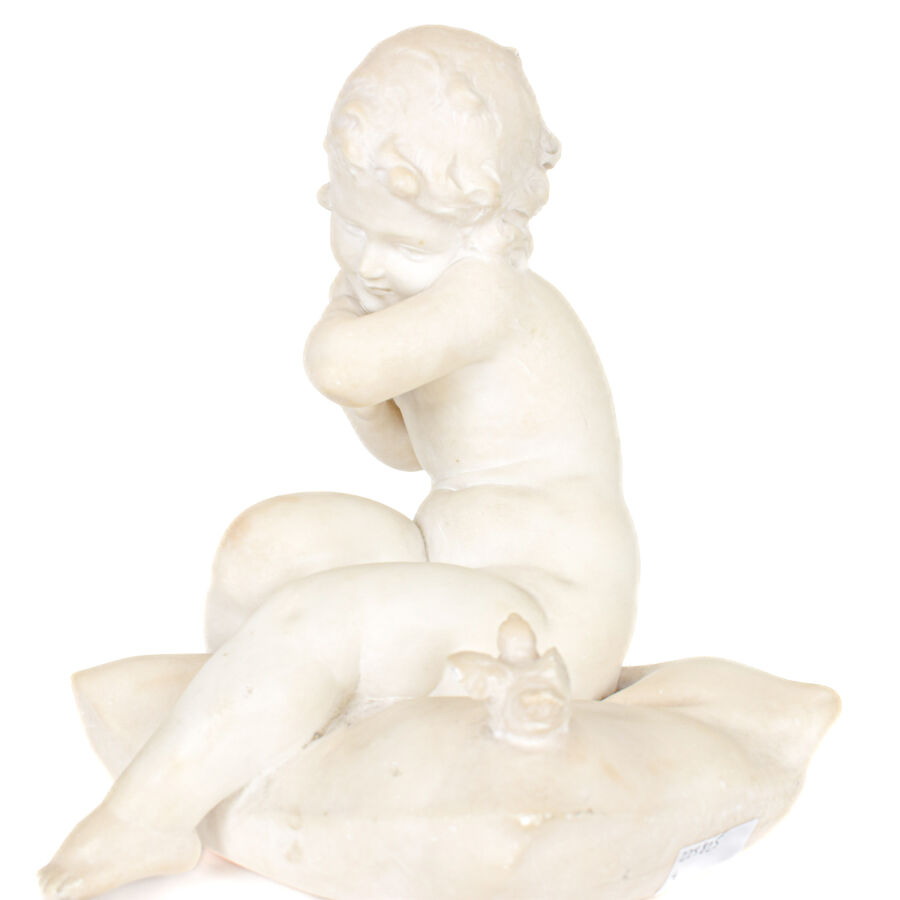 Affortunato GORI (1886-1925), "Jeune enfant au coussin et à l'oiseau", marbre blanc, 22 x 29 x 29 cm. (petit accident à l'aile, éclat au pouce et au majeur).