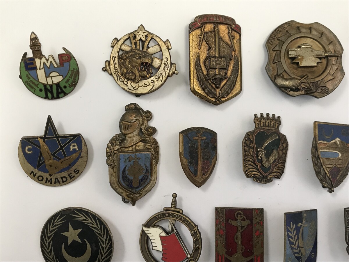 AFRIQUE - Ensemble comprenant environ 16 INSIGNES dont ECOLE MILITAIRE PREPARATOIRE AFRICAINE (Drago Paris), BATAILLON COMORIEN MIXTE ((G907 - Drago Paris, boléro déformé), 10ème LEGION DE GENDARMERIE ALGER (Arthus Bertrand désargenté), SAA (G448 - Drago Paris), 67ème RAA (H203 - Drago Paris), 32ème GROUPE VETERINAIRE (G1496- Drago Paris), COMPAGNIES NOMADES D'ALGERIE (G123 - Drago Paris), 21ème DIA (Drago Paris Nice Olivier Métra), GMS (sans), ECOLE MILITAIRE CHERCHELL (sans), 64ème RAA (Drago Paris - Boléro ressoudé), GAC LEVANT (Drago Paris Nice Béranger), MAURITANIE - GARDE REPUBLICAINE TERRITORIALE 1958-1960 (Drago Paris), DIVISION MAROCAINE - 3ème BATAILLON ESM SAINT-CYR (G3329 - Fraisse), TCHAD - 1er BATAILLON (Drago Paris) et 428ème COMPAGNIE DE REPARATION AURES (Arthus Bertrand Paris), la plupart de ces insignes ont été vernis et un nettoyage à l'acétone leur redonnera leur aspect d'origine, BE.
