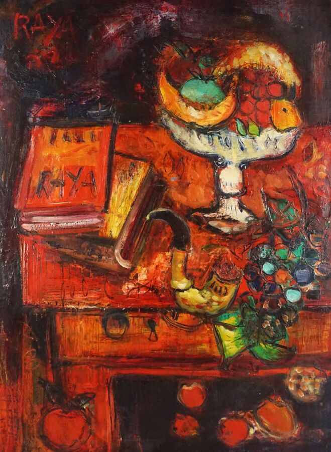 Alain RAYA-SORKINE (1936-2022), "Nature morte à la pipe, coupe de fruits et au livre", huile sur toile signée en haut à gauche, 73 x 54 cm.