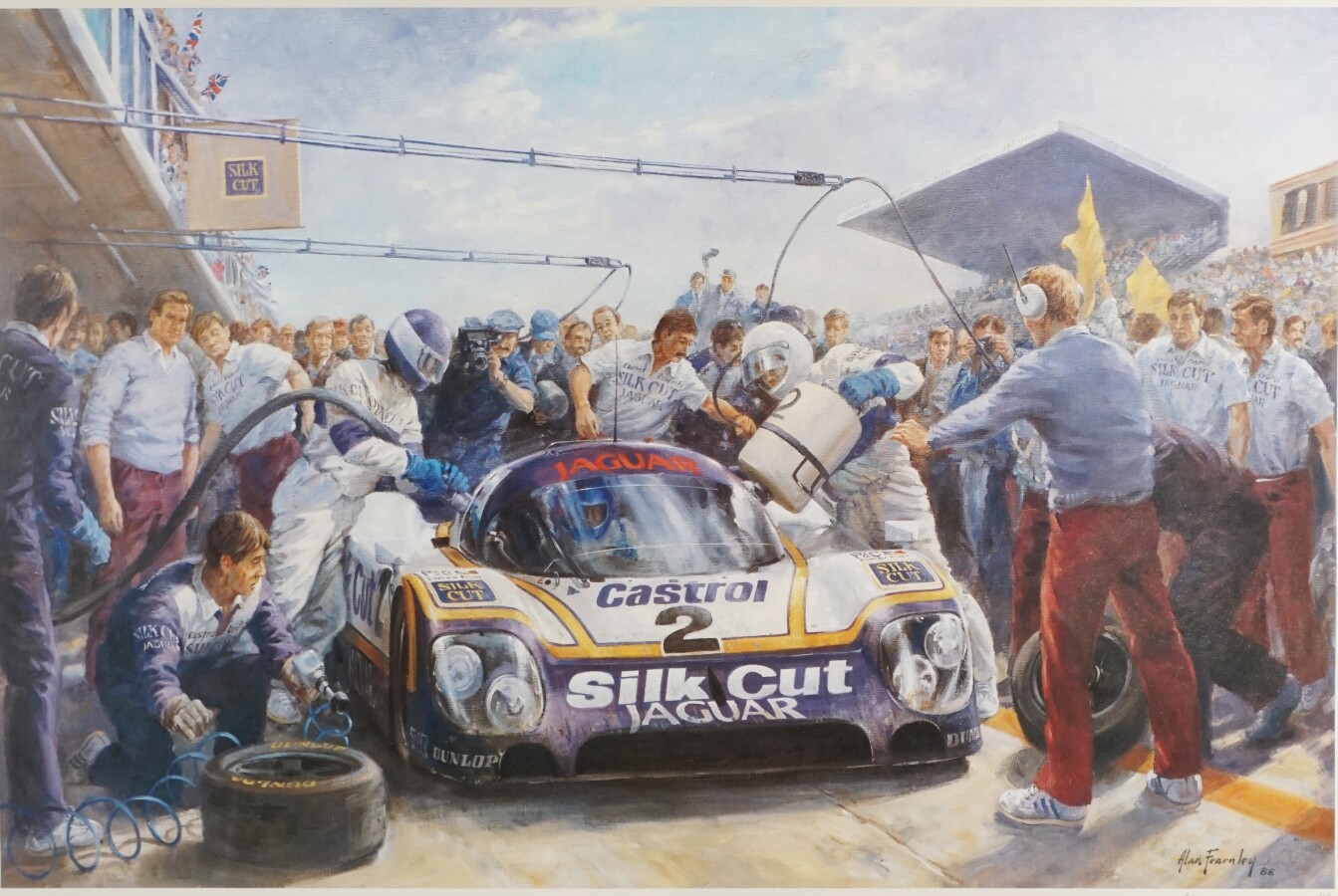 Alan FEARNLEY (1942), "Last pit stop before victory", impression offset, signée et datée 88 dans la planche, contresignée et numérotée 168/850 au crayon dans la marge, publiée par "Grand prix sportique 1988", 62.5 x 45.5 cm.