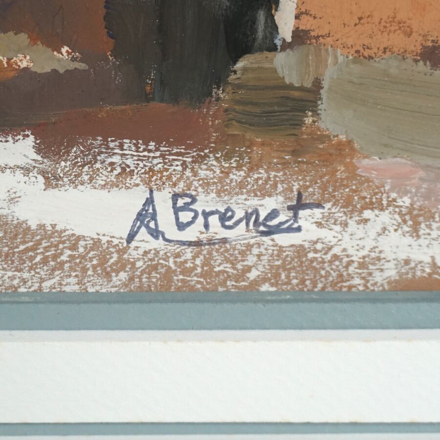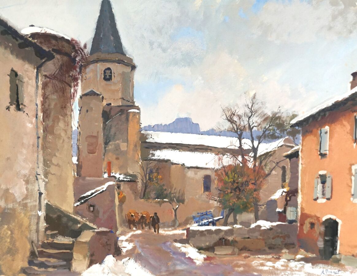 Albert BRENET (1903-2005), "Village du Cantal sous la neige", gouache sur papier, signée en bas à droite, 44.5 x 57.5 cm (à vue) (petits trous de punaise aux coins).