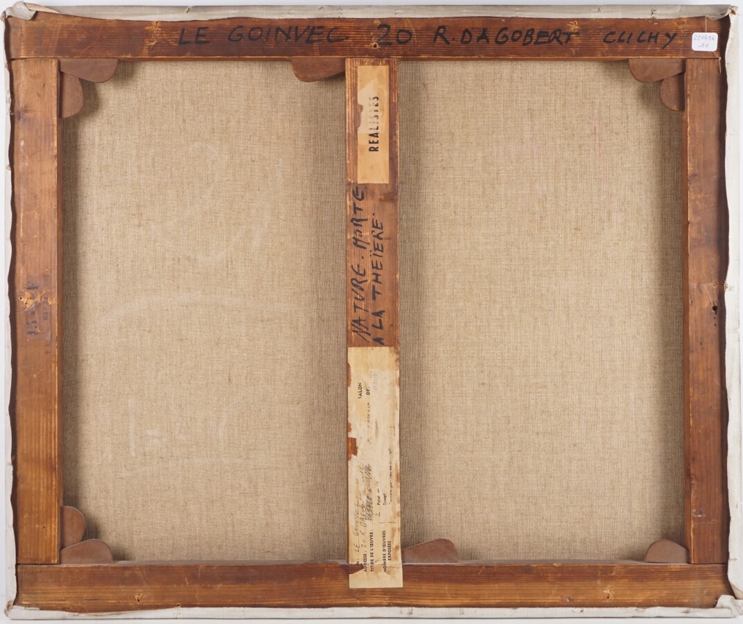 Albert LE GOINVEC (XXe), "Nature morte à la théière et aux poires" 1958, huile sur toile, datée et signée en bas à droite, 54 x 65 cm.