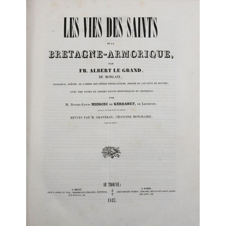 ALBERT LE GRAND (Frère). Les Vies des Saints de la Bretagne-Armorique [...] Avec des notes et observations historiques et critiques par M. Daniel-Louis MIORCEC de KERDANET [...] Brest, P. Anner et fils, Paris, Isidore Pesron, 1837. In-4 basane havane, dos à nerfs richement orné, p. de titre en mar. rouge et vert, encadrement de doubles filets dorés, ruban à froid et hermines dorées en écoinçons, tr. rouges (reliure de l'époque). Qqs lég. frottés. Mors fragilisés.