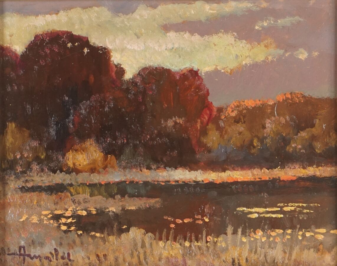 Albert MALET (1905-1986), "Etang à Gouville ", huile sur panneau d'isorel, signée en bas à gauche et contresignée au dos, 18 x 23 cm.