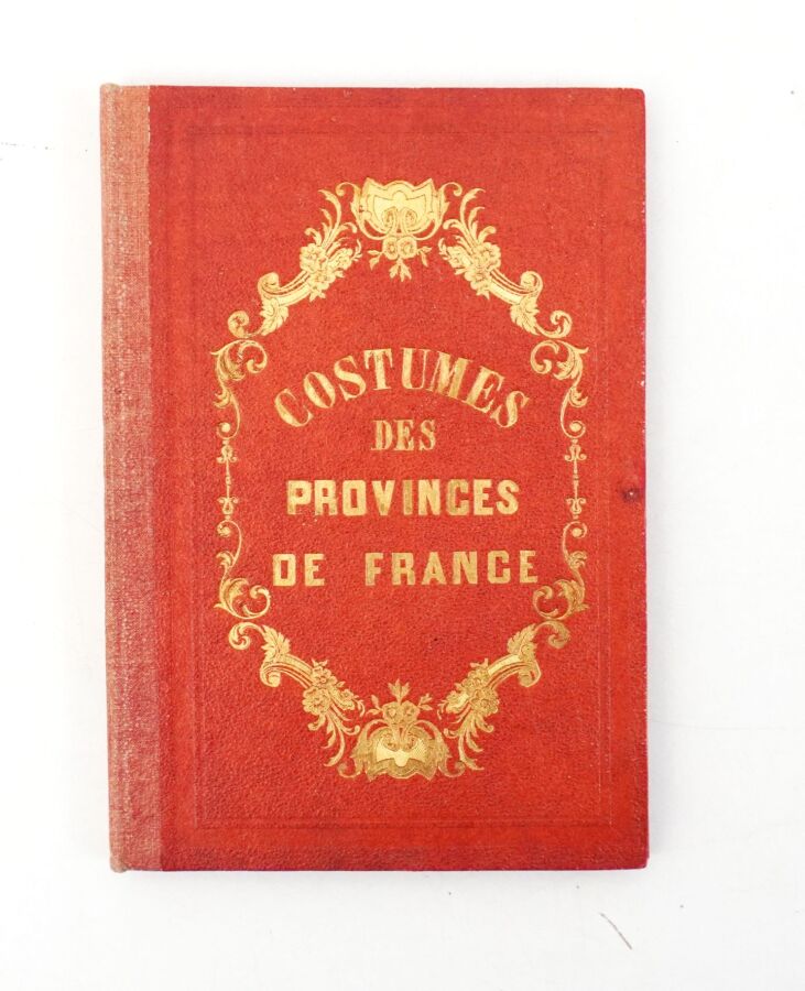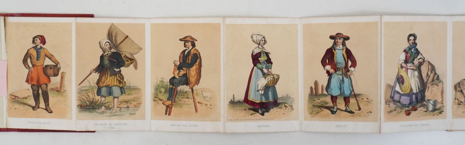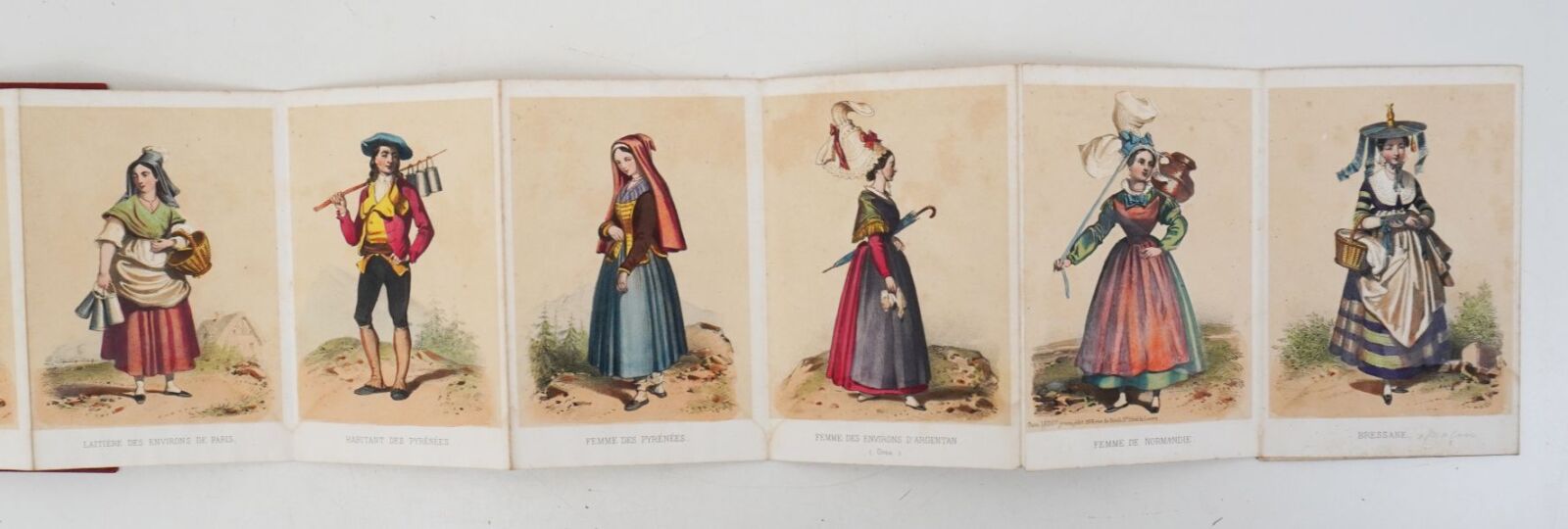 Album. Costumes des provinces de France. Paris, Lédot, [vers 1850]. In-12 (163 x 110 mm) en accordéon, comprenant 18 gravures aquarellées. Chemise en demi-percaline rouge, plats recouverts de papier chagriné, tire et encadrement floral dorés sur le premier plat (cartonnage de l'éditeur).