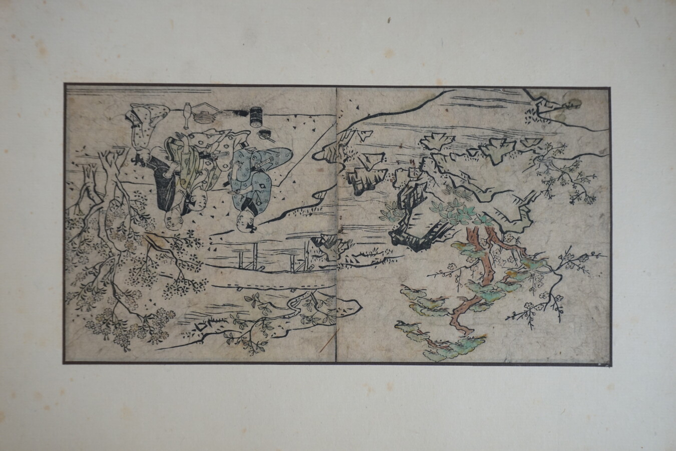 Album de 11 double-page de livre dans le style de Moronobu, imprimé en sumi-e et rehaussé de jaune et orange, représentant diverses scènes animées de personnages dans des paysages et des pavillons, Japon, 17e siècle Dimension d'une double-page : 16.5 x 32.3 cm (petites taches).