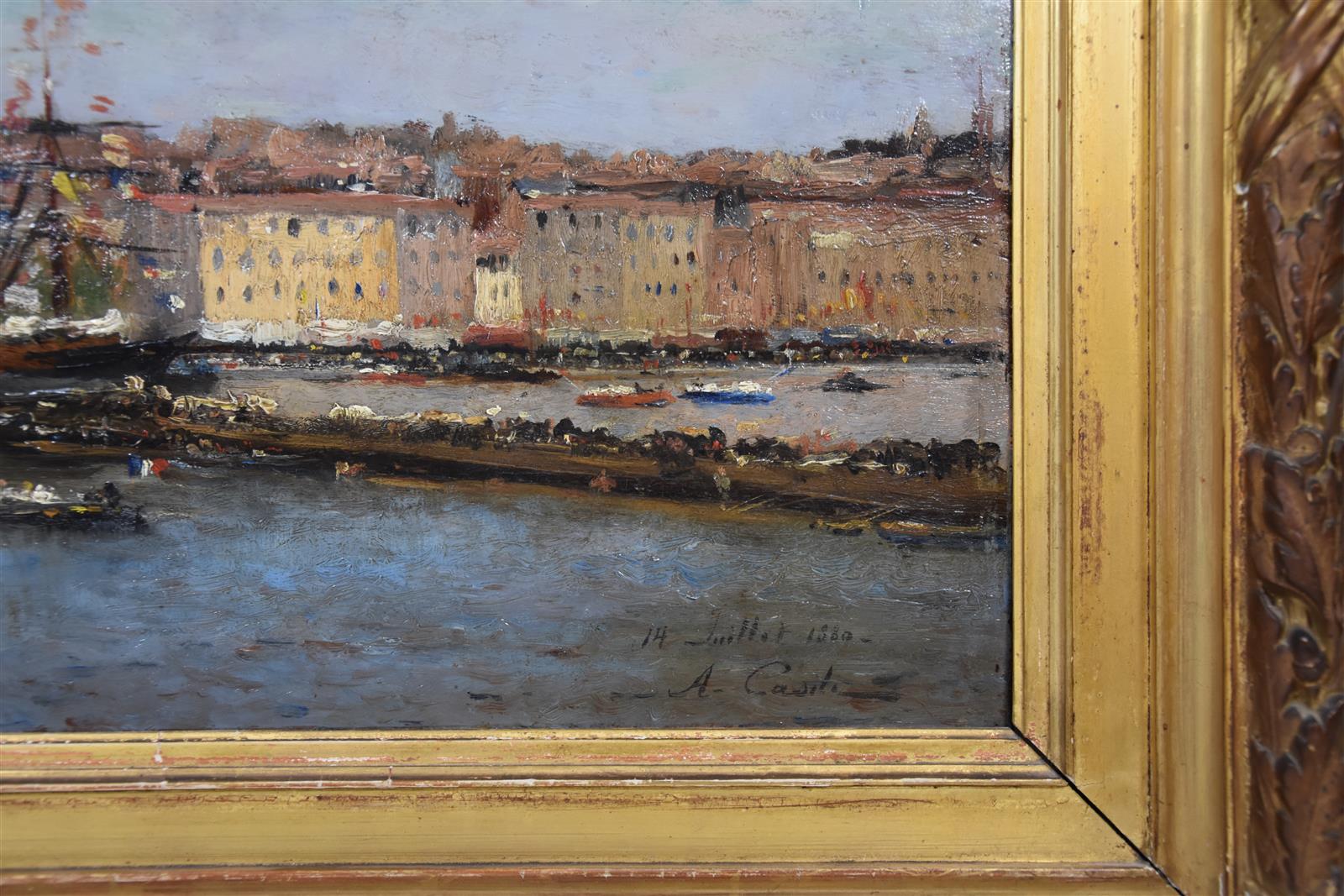 Alfred CASILE (1848-1909), "Bateaux à quai au grand pavois dans le port de Marseille" 14 juillet 1880, huile sur panneau d'acajou, signée et datée en bas à droite, 38 x 60 cm (à nettoyer, quelques petits manques en bordure du cadre, lègères traces d'humidité sur le dos du panneau)
