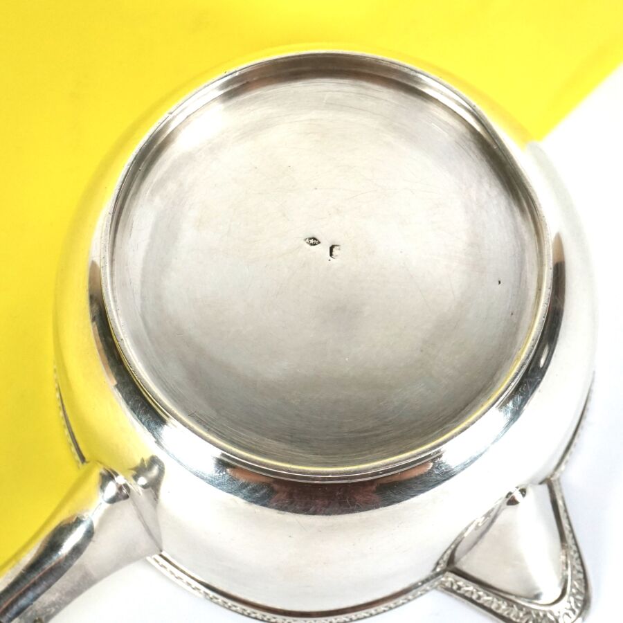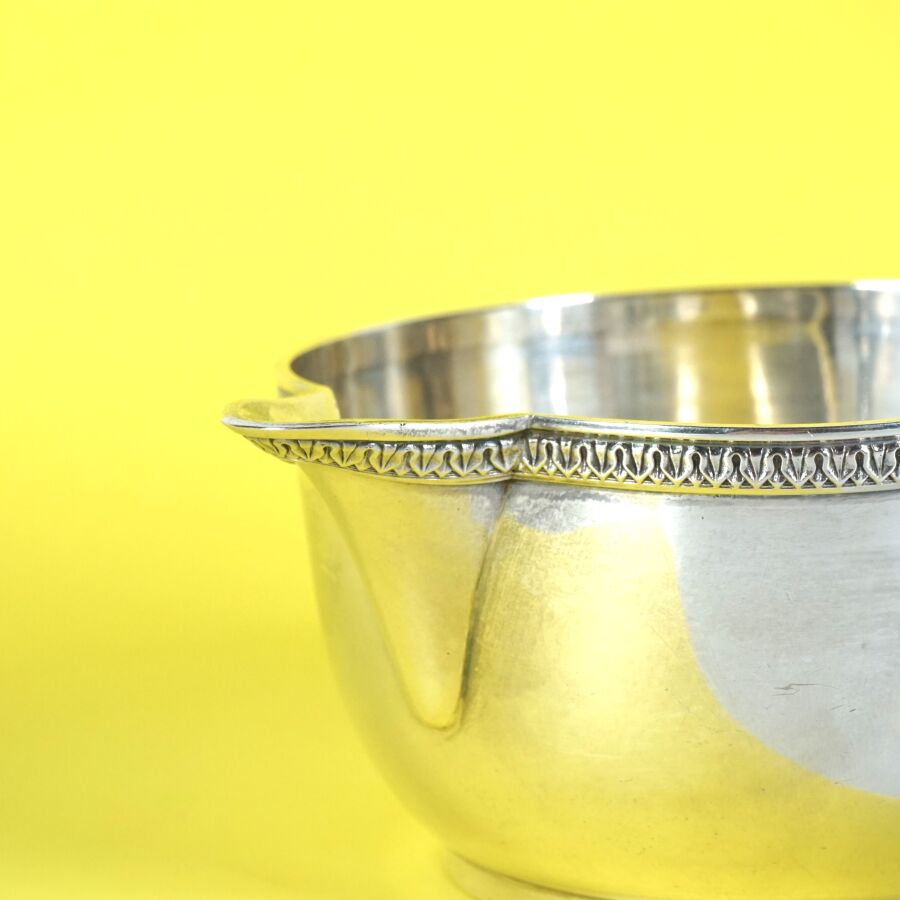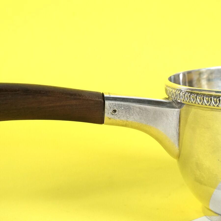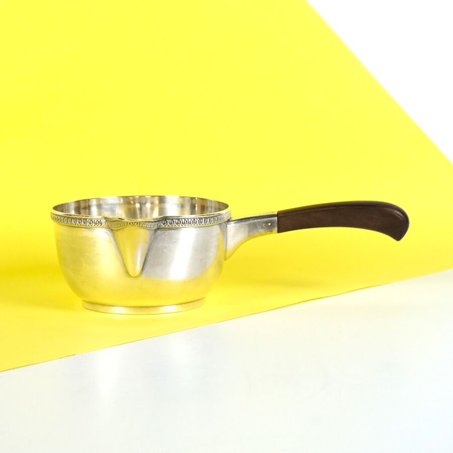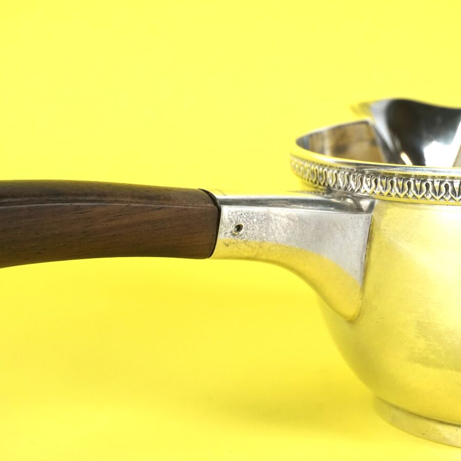 Alfred HECTOR : Petite casserole en argent, poinçon Minerve 1er titre, poinçon de Maître Orfèvre "AH", le différent à motif d'une étoile à cinq branches, bordure à motif d'une frise de raie-de-coeur, manche latéral en bois, la monture portant l'inscription "Belloir Paris", L (avec le bec verseur) : 13.2 cm. H. 5.3 cm. Poids brut : 242 g environ (manque une vis).