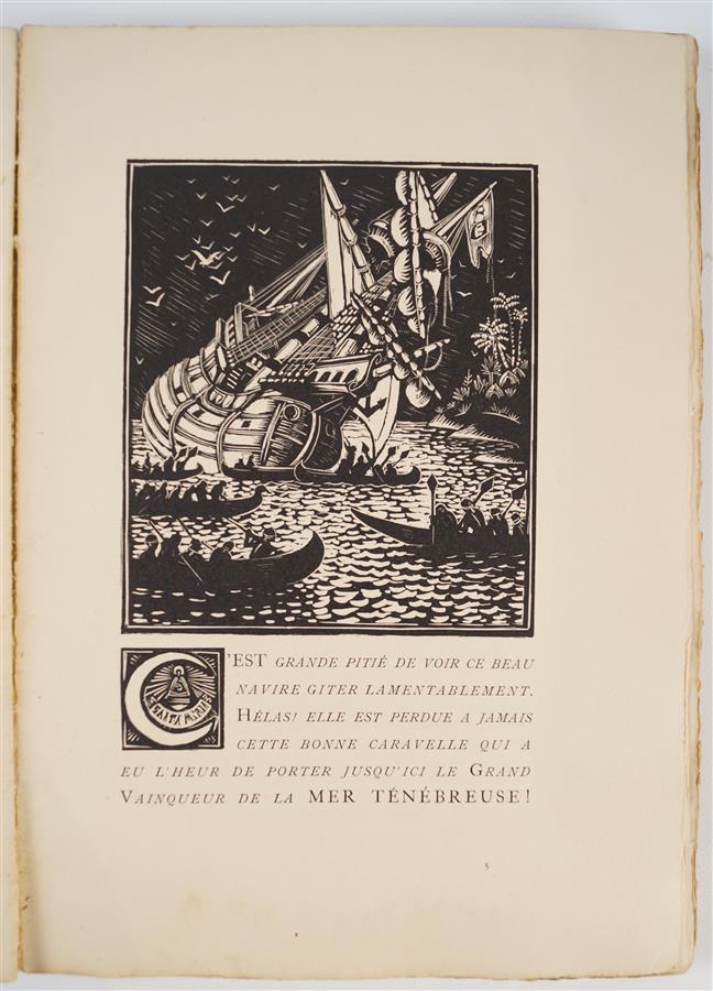 ALLAUX (Jean-Paul) - L'histoire merveilleuse de Christophe Colomb [] - Paris ; Editions d'art Devambez, 1924 - 1 volume In-4° broché sous couverture illustrée rempliée (1ère charnière fendue, petites fentes partielles aux mors) - Quelques rares rousseurs éparses - 1 carte dépliante in fine, gravures sur bois in et hors-texte en noir par Gustave Allaux, cartes géographiques, titre en rouge et noir - Bon exemplaire numéroté sur vélin de Rives (n°791 sur les 820, tirage total à 950).