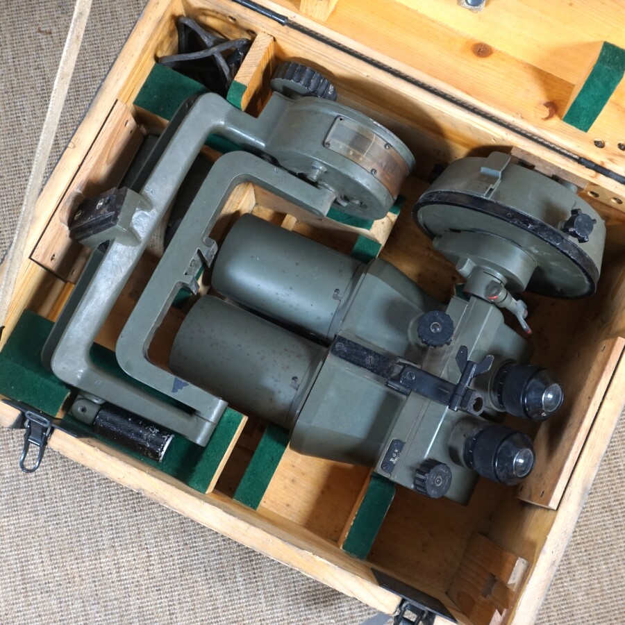ALLEMAGNE 1933-1945 - BINOCULAIRE FLAK DE MARQUE DKL, MODELE DF, numéro 45012 et aigle allemand probablement rapporté, optique " 10 x 80 ", avec trépied acier dont porte-pied (avec ses deux gamelles et chaines), CAISSE BOIS alvéolée avec accessoires dont boite à piles, pares soleil, viseur…, ABE/BE.