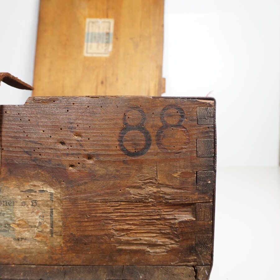 ALLEMAGNE 1933-1945 - CAISSE A MUNITIONS en bois pour 1 500 cartouches de 7.92 mm, sangles de fermeture en cuir craquelé, restants d'étiquettes, accidents et manques, 48 x 35 x 16 cm, BE.