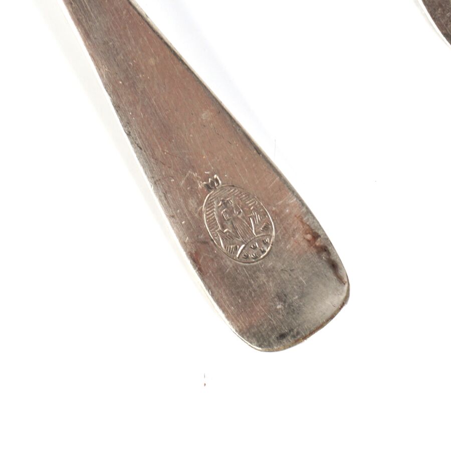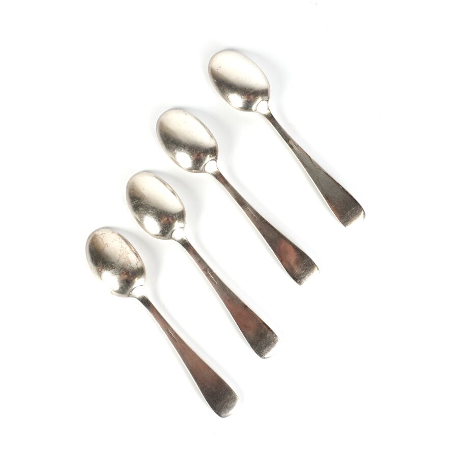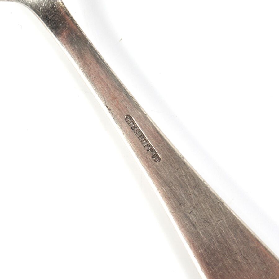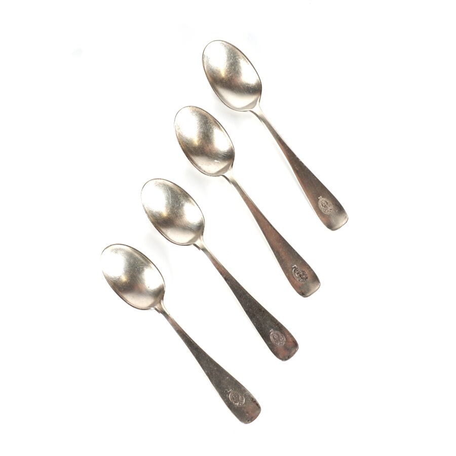 ALLEMAGNE - 1933-1945 - HOTEL PLATTERHOF - BERCHTESGADEN OBERSALZBERG - Série de 4 PETITES CUILLERES, en métal argenté, sigle de l'hôtel (jeune bavaroise en costume devant des montagnes dans un médaillon ovale), marquée du nom du fabricant " GEBR. HEPP 90 ", hauteur : 7 cm, ETAT D'USAGE.