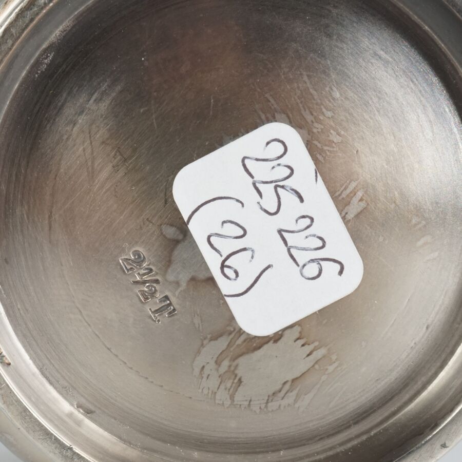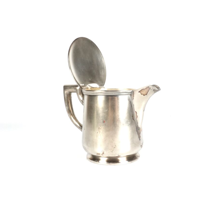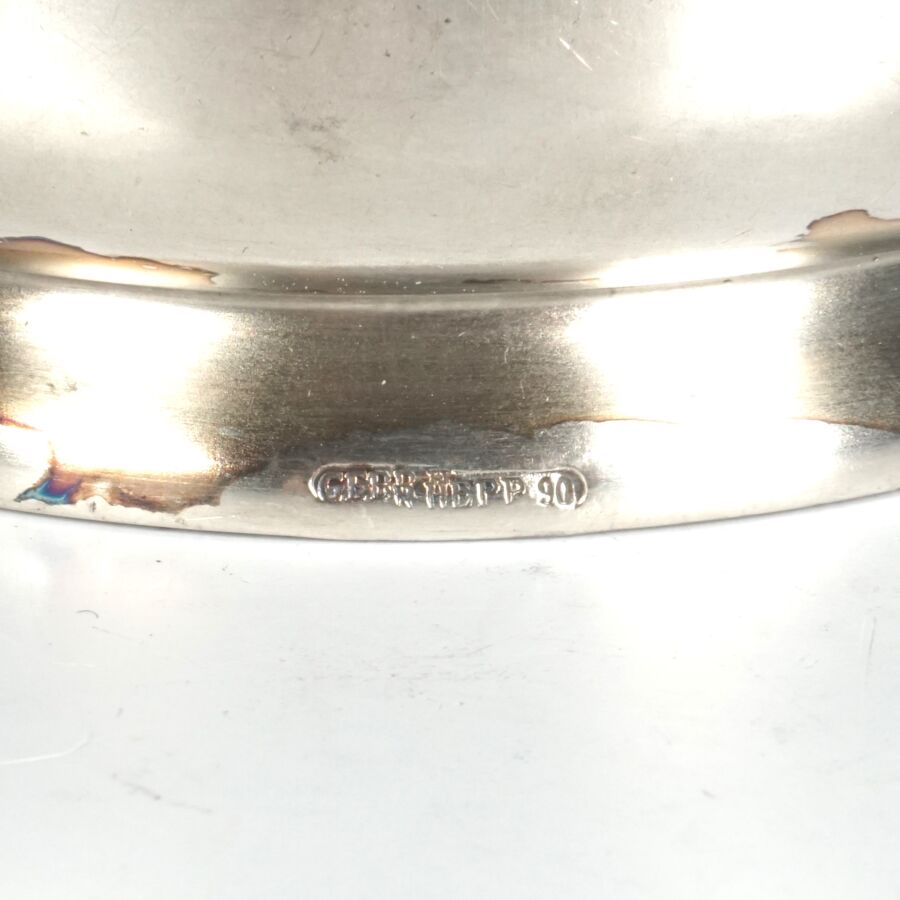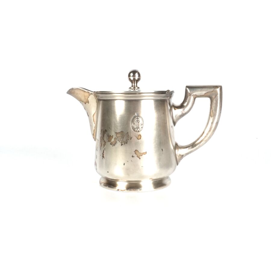 ALLEMAGNE - 1933-1945 - HOTEL PLATTERHOF - BERCHTESGADEN OBERSALZBERG - THEIERE EGOISTE, en métal argenté, sigle de l'hôtel (jeune bavaroise en costume devant des montagnes dans un médaillon ovale), marquée du nom du fabricant " GEBR. HEPP 90 ", hauteur : 8 cm, ETAT D'USAGE.
