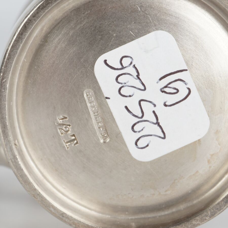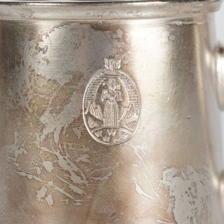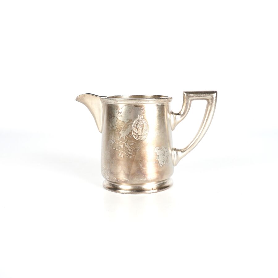 ALLEMAGNE - 1933-1945 - HOTEL PLATTERHOF - BERCHTESGADEN OBERSALZBERG - CREMIER, en métal argenté, sigle de l'hôtel (jeune bavaroise en costume devant des montagnes dans un médaillon ovale), marquée du nom du fabricant " GEBR. HEPP 90 ", hauteur : 7 cm, ETAT D'USAGE.