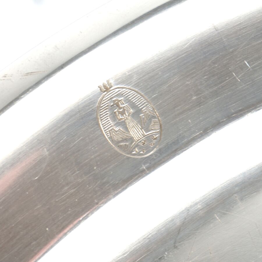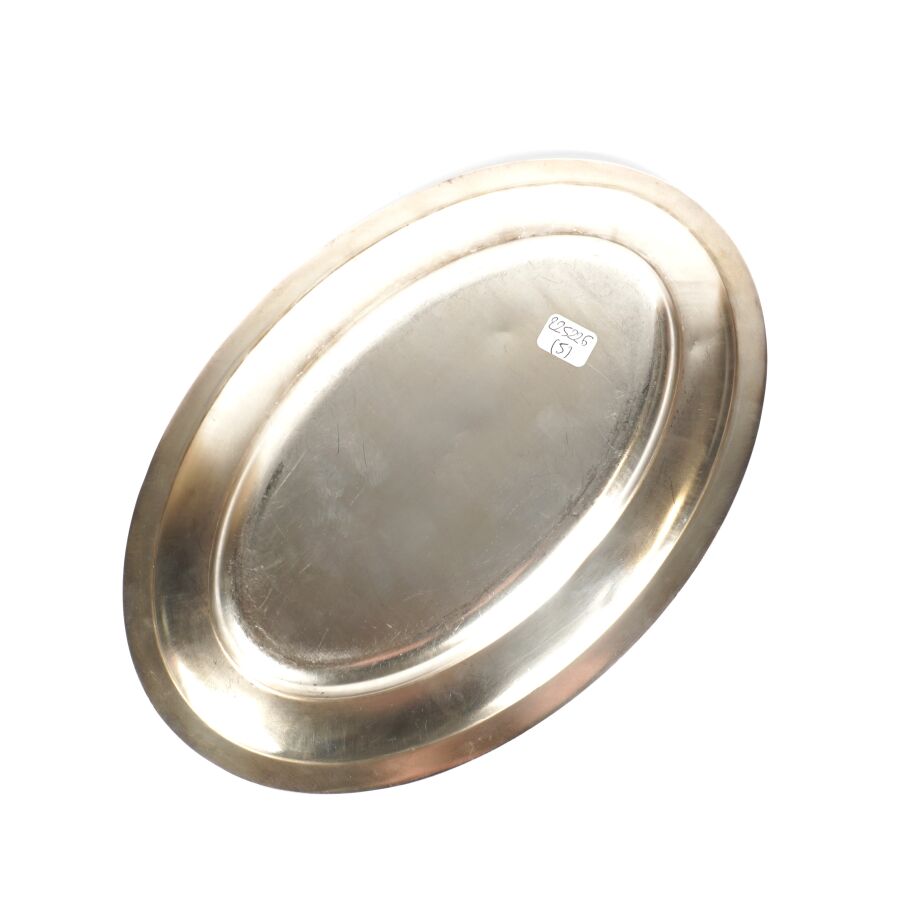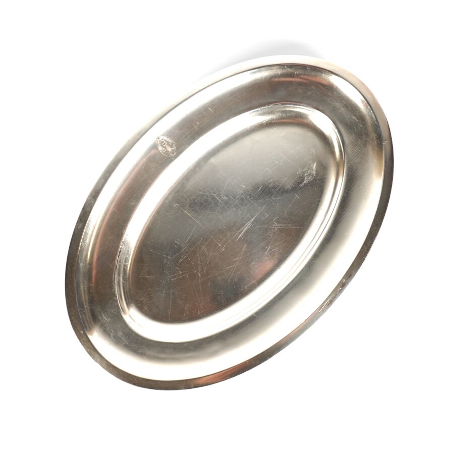 ALLEMAGNE - 1933-1945 - HOTEL PLATTERHOF - BERCHTESGADEN OBERSALZBERG - PLAT DE SERVICE, de forme ovale en métal argenté, sigle de l'hôtel (jeune bavaroise en costume devant des montagnes dans un médaillon ovale), marquée du nom du fabricant " GEBR. HEPP 90 ", hauteur : 22 x 32 cm, ETAT D'USAGE.
