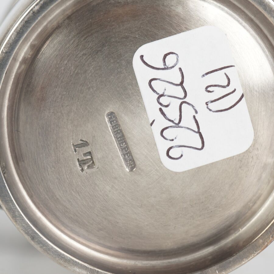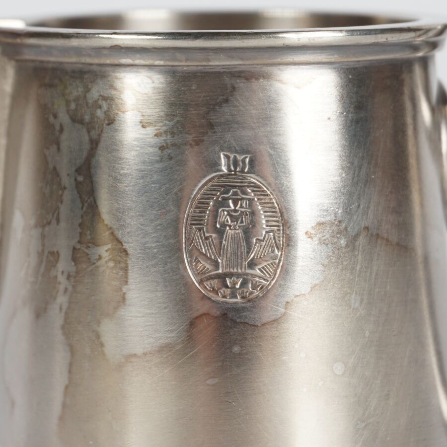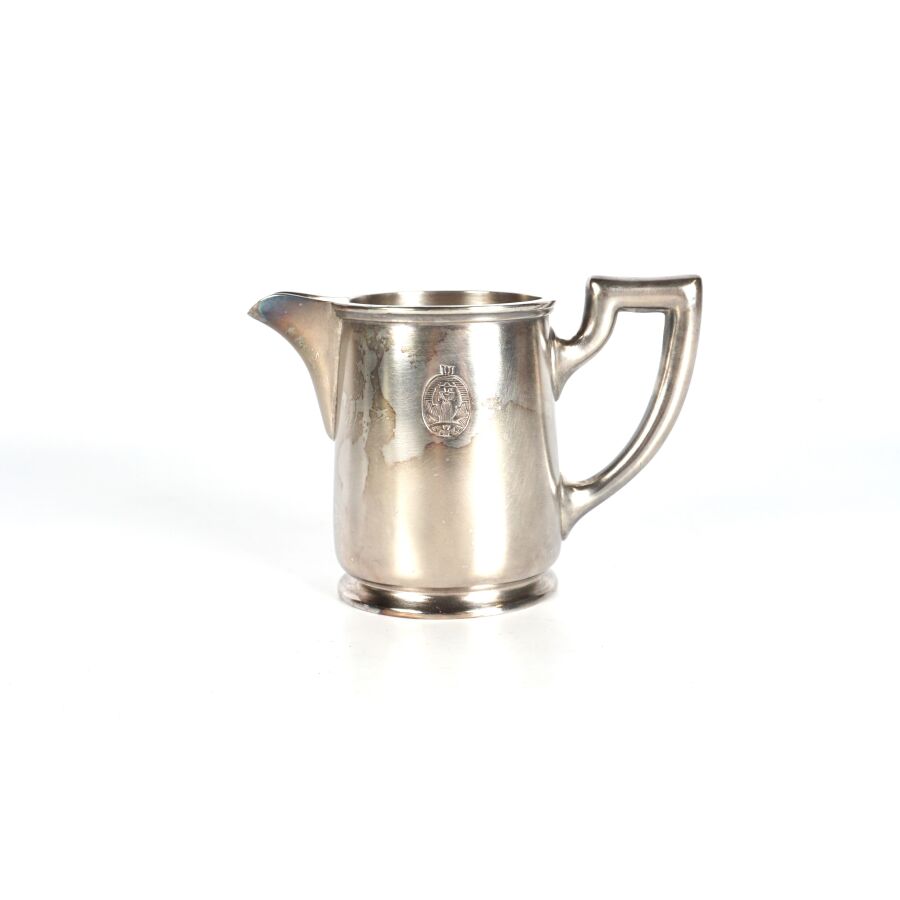 ALLEMAGNE - 1933-1945 - HOTEL PLATTERHOF - BERCHTESGADEN OBERSALZBERG - POT A LAIT, en métal argenté, sigle de l'hôtel (jeune bavaroise en costume devant des montagnes dans un médaillon ovale), marquée du nom du fabricant " GEBR. HEPP 90 ", hauteur : 8 cm, ETAT D'USAGE.