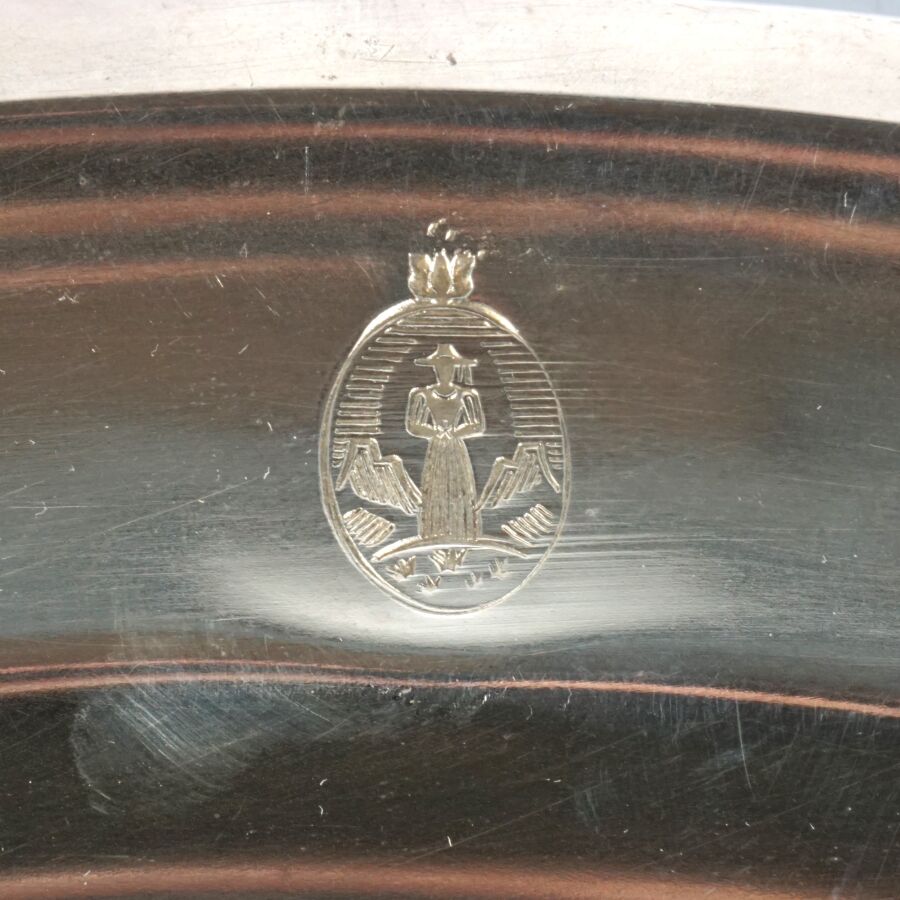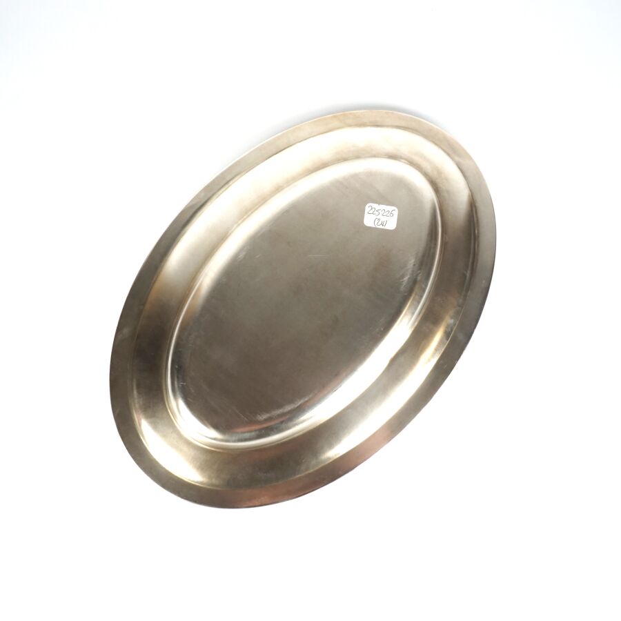 ALLEMAGNE - 1933-1945 - HOTEL PLATTERHOF - BERCHTESGADEN OBERSALZBERG - PLAT DE SERVICE, de forme ovale en métal argenté, sigle de l'hôtel (jeune bavaroise en costume devant des montagnes dans un médaillon ovale), marquée du nom du fabricant " GEBR. HEPP 90 ", hauteur : 22 x 32 cm, ETAT D'USAGE.