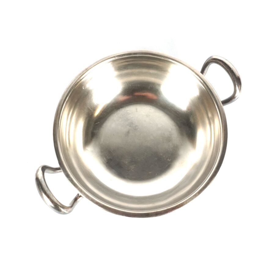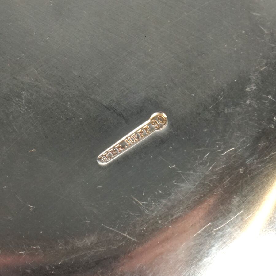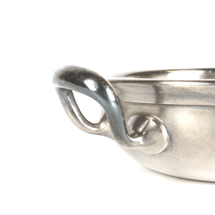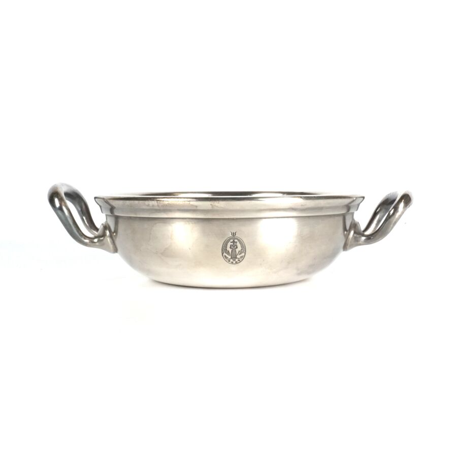 ALLEMAGNE - 1933-1945 - HOTEL PLATTERHOF - BERCHTESGADEN OBERSALZBERG - BOUILLON, en métal argenté, sigle de l'hôtel (jeune bavaroise en costume devant des montagnes dans un médaillon ovale), marquée du nom du fabricant " GEBR. HEPP 90 ", diamètre : 15 cm, ETAT D'USAGE.