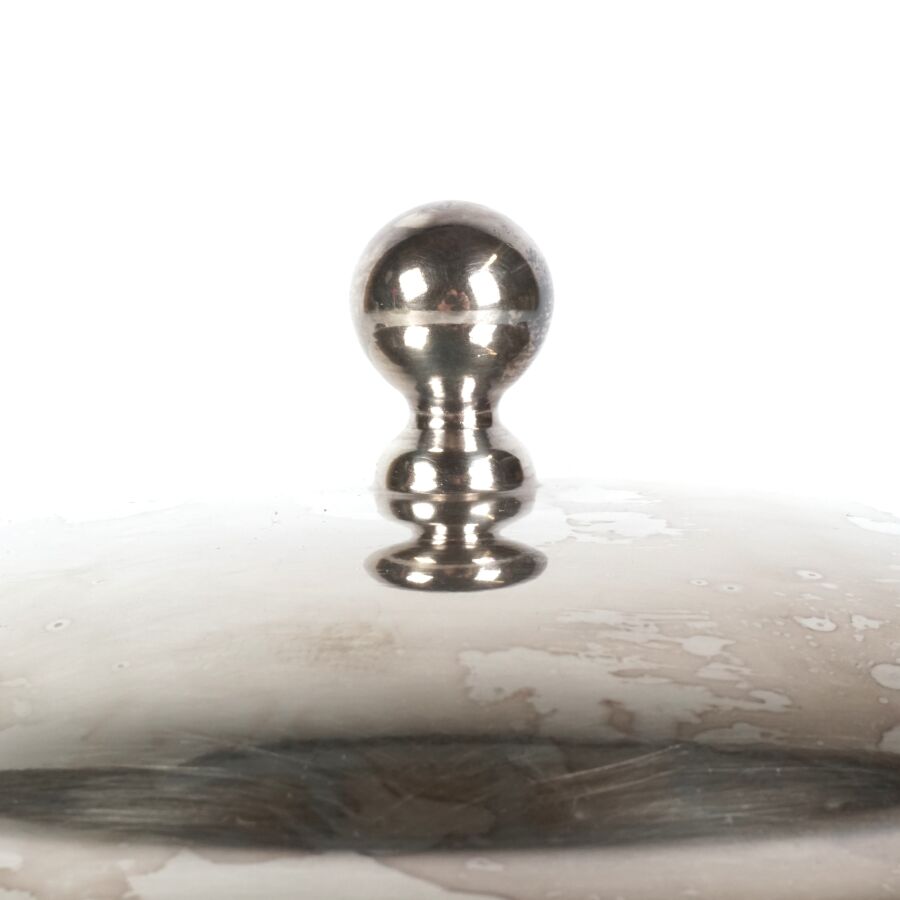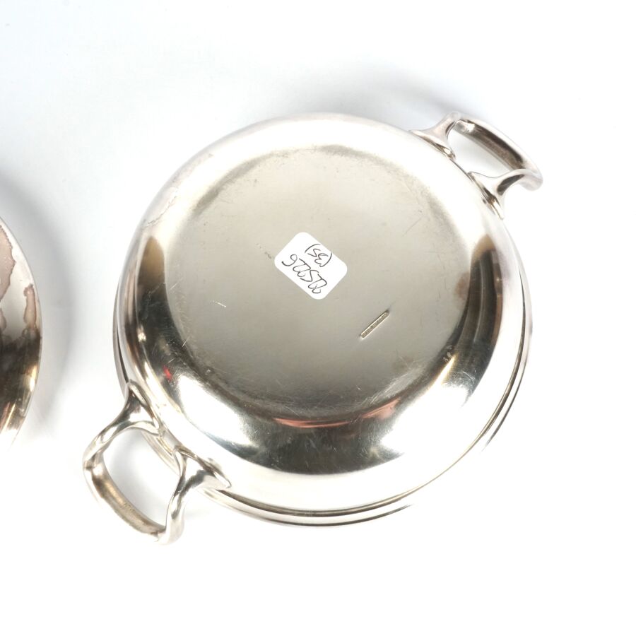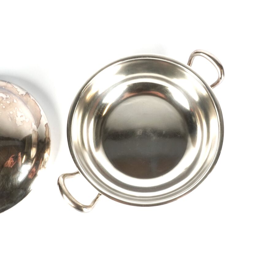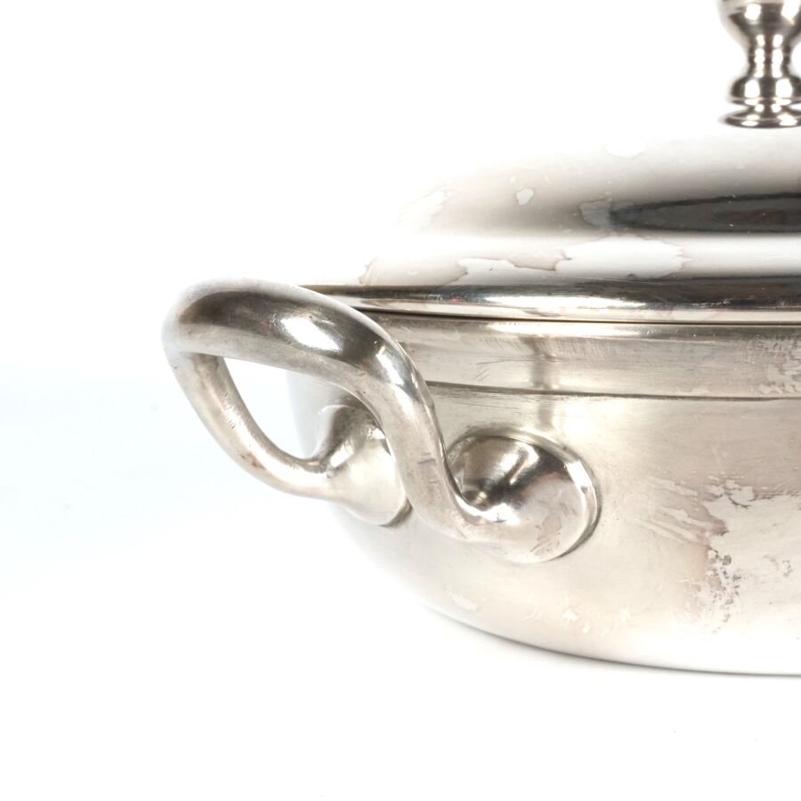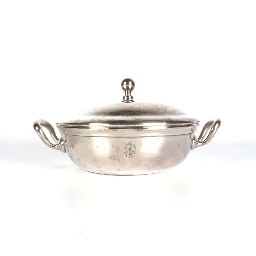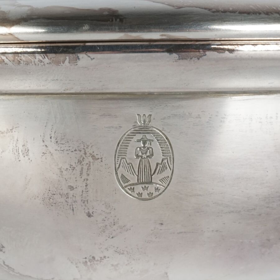 ALLEMAGNE - 1933-1945 - HOTEL PLATTERHOF - BERCHTESGADEN OBERSALZBERG - BOUILLON COUVERT, en métal argenté, sigle de l'hôtel (jeune bavaroise en costume devant des montagnes dans un médaillon ovale), marquée du nom du fabricant " GEBR. HEPP 90 ", diamètre : 15 cm, ETAT D'USAGE.