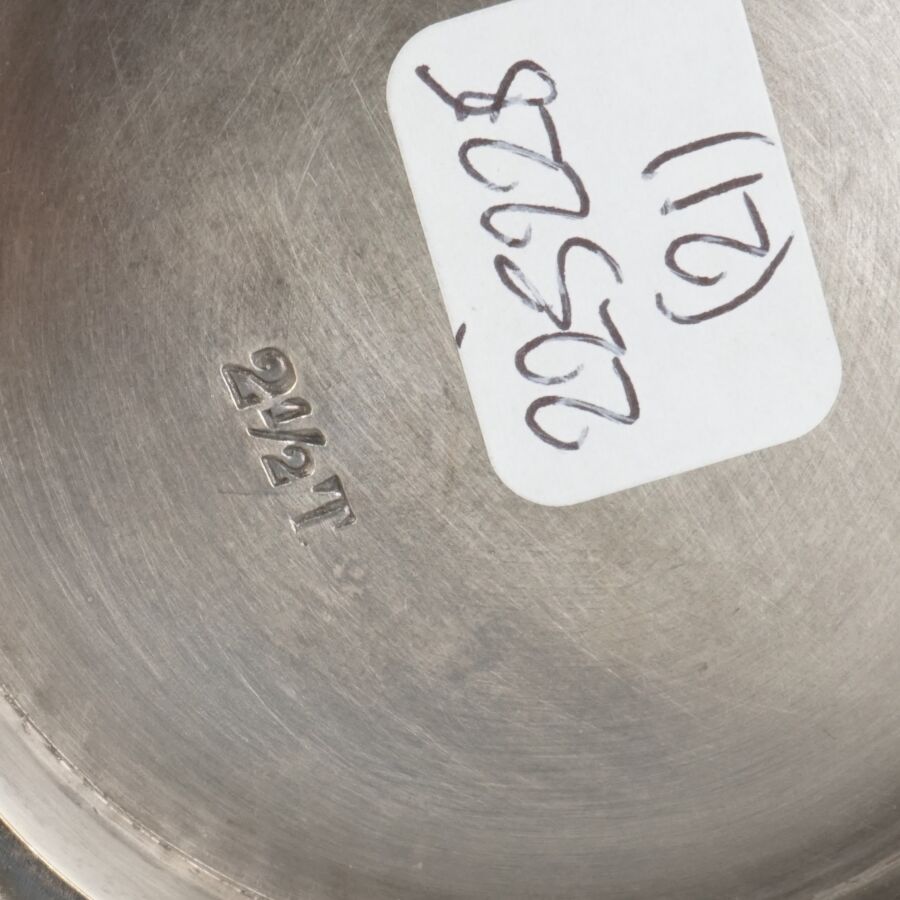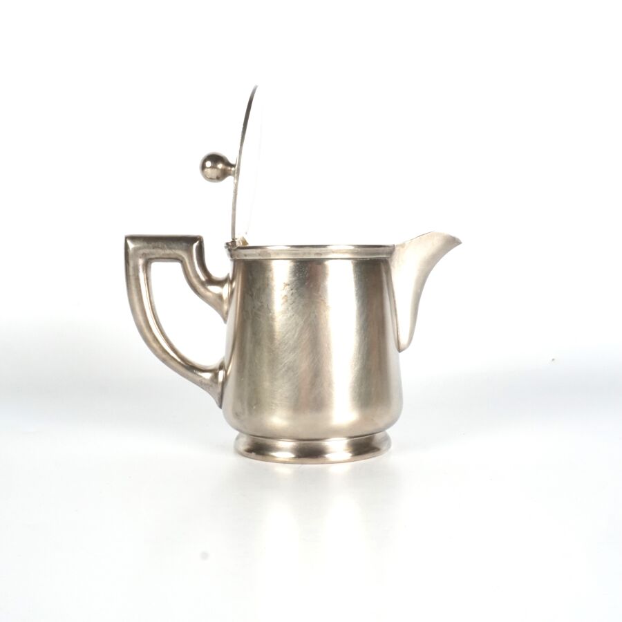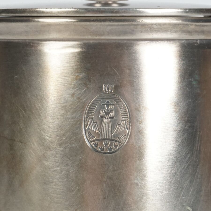 ALLEMAGNE - 1933-1945 - HOTEL PLATTERHOF - BERCHTESGADEN OBERSALZBERG - THEIERE EGOISTE, en métal argenté, sigle de l'hôtel (jeune bavaroise en costume devant des montagnes dans un médaillon ovale), marquée du nom du fabricant " GEBR. HEPP 90 ", hauteur : 8 cm, ETAT D'USAGE.