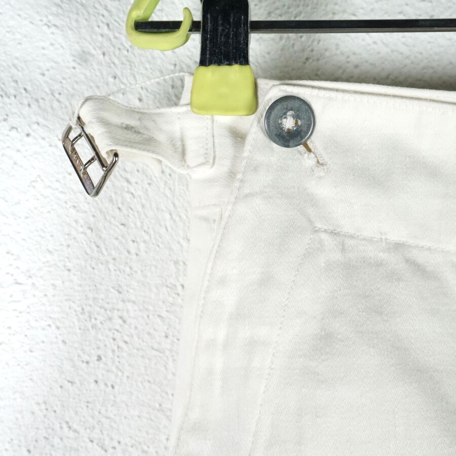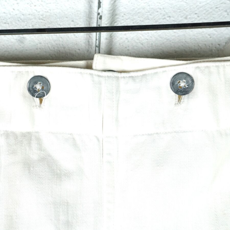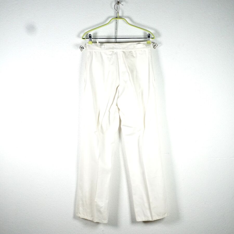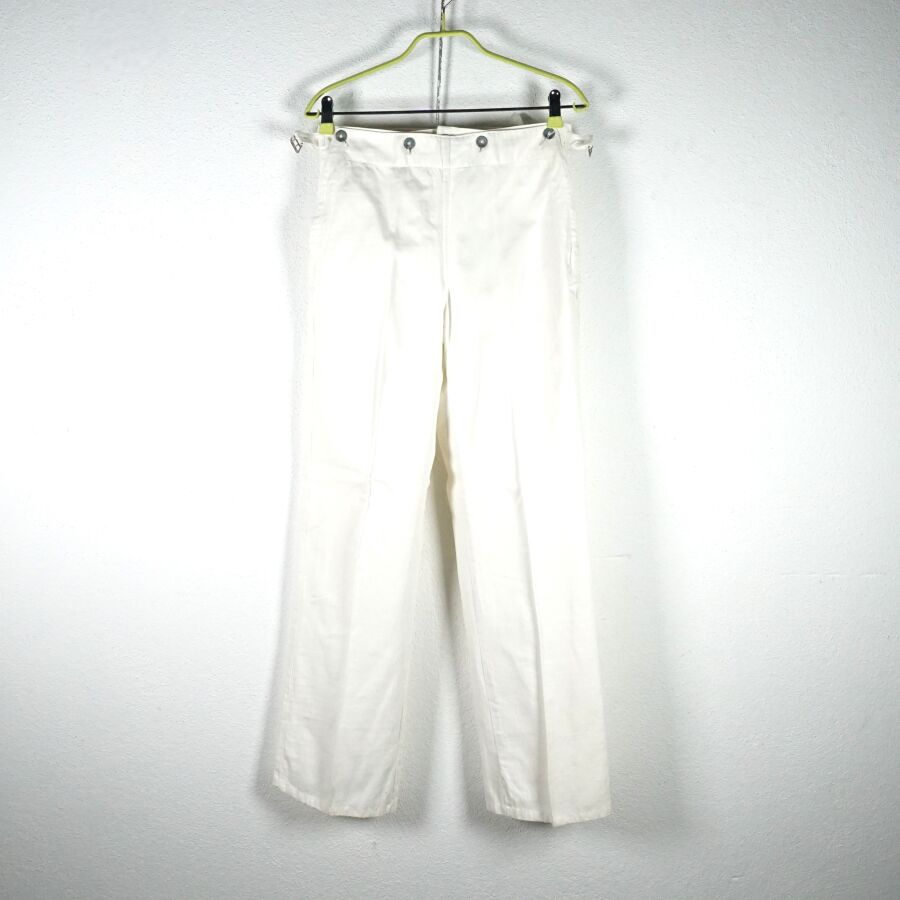 ALLEMAGNE 1933-1945 - KRIEGSMARINE - PANTALON A PONT droit en coton blanc, sangles de serrage sur les côtés, fins boutons en métal blanc, petite taille (80/80), longueur environ : 105 cm, TBE (neuf de stock).