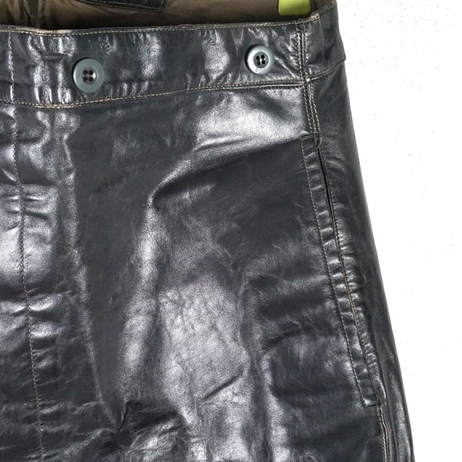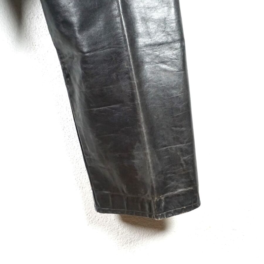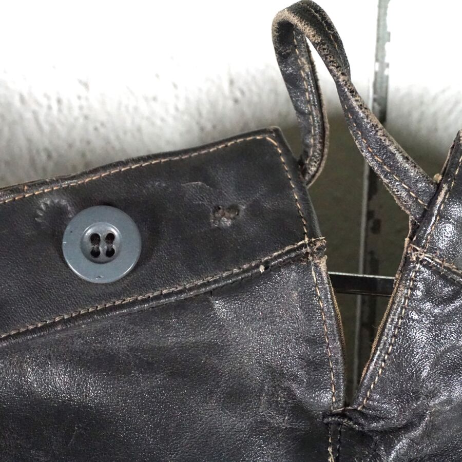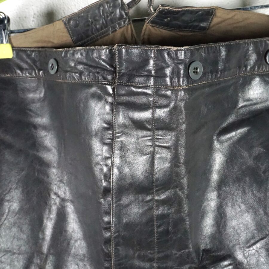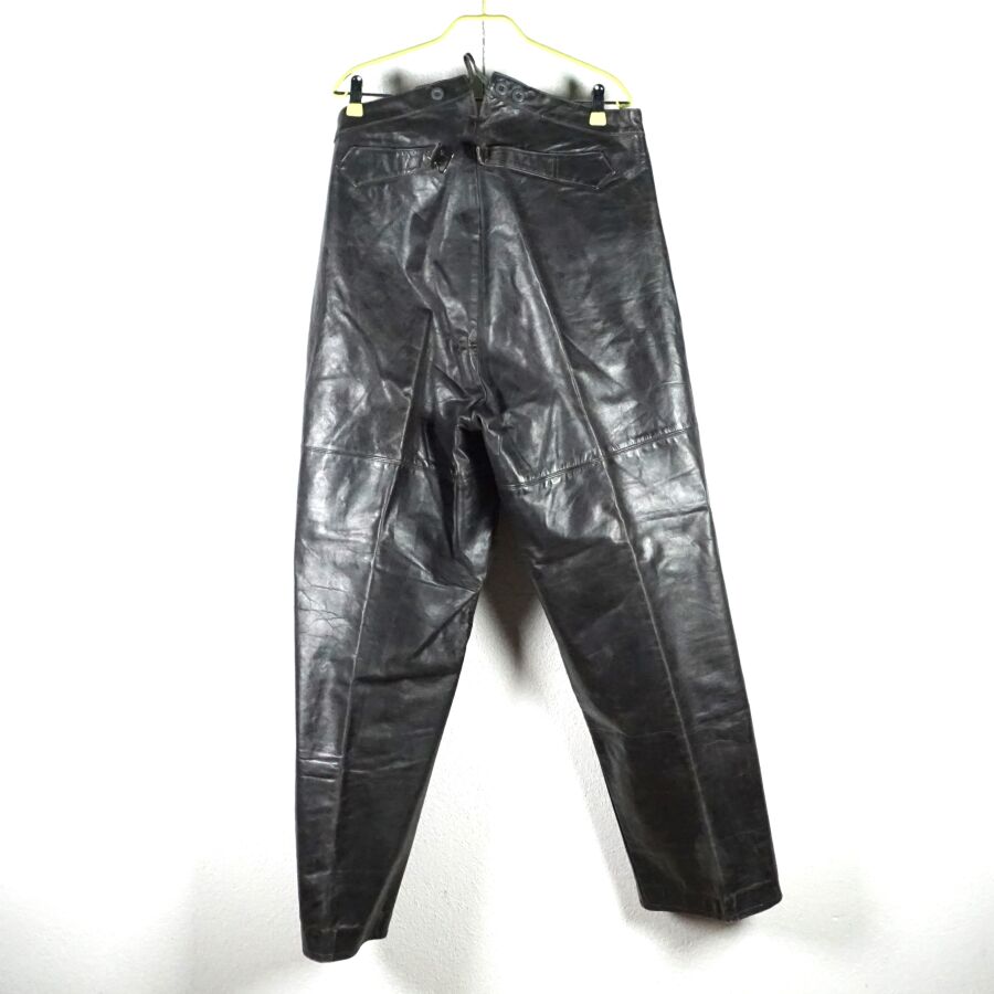 ALLEMAGNE 1933-1945 - KRIEGSMARINE - PANTALON droit en cuir noir, doublure en coton kaki (petites déchirures), boutons bakélite gris, boutons de la braguettes rapportés (manques), sangle de serrage pour ajustement en bas du dos, longueur environ : 114 cm, petites craquelures et usures, BE/TBE.
