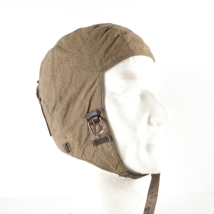 ALLEMAGNE 1933-1945 - LUFTWAFFE - BONNET ETE DE PILOTE, en toile feldgrau, intérieur façon mouton, étiquette avec inscription " RBNr 0/0380/0241 ", jugulaire en cuir complète, pattes en cuir pour fixation d'une paire de lunettes et/ou masque à oxygène, Seconde Guerre Mondiale, BE.