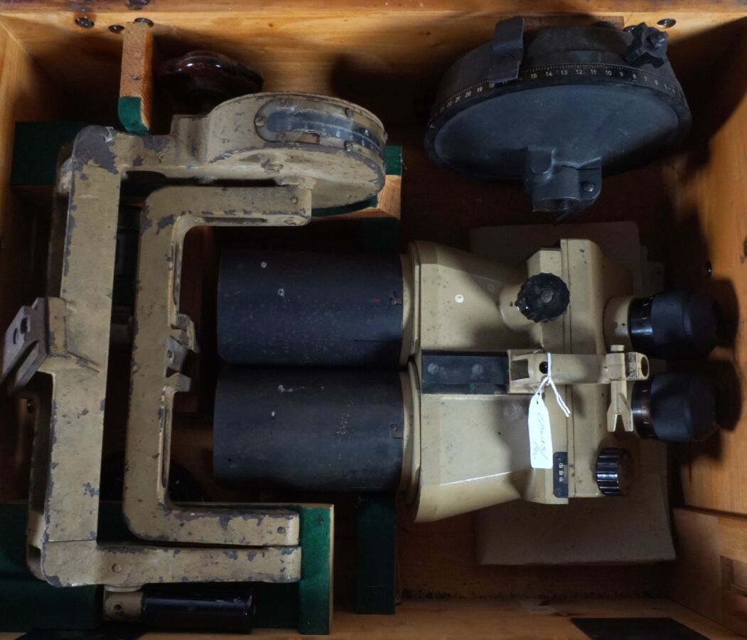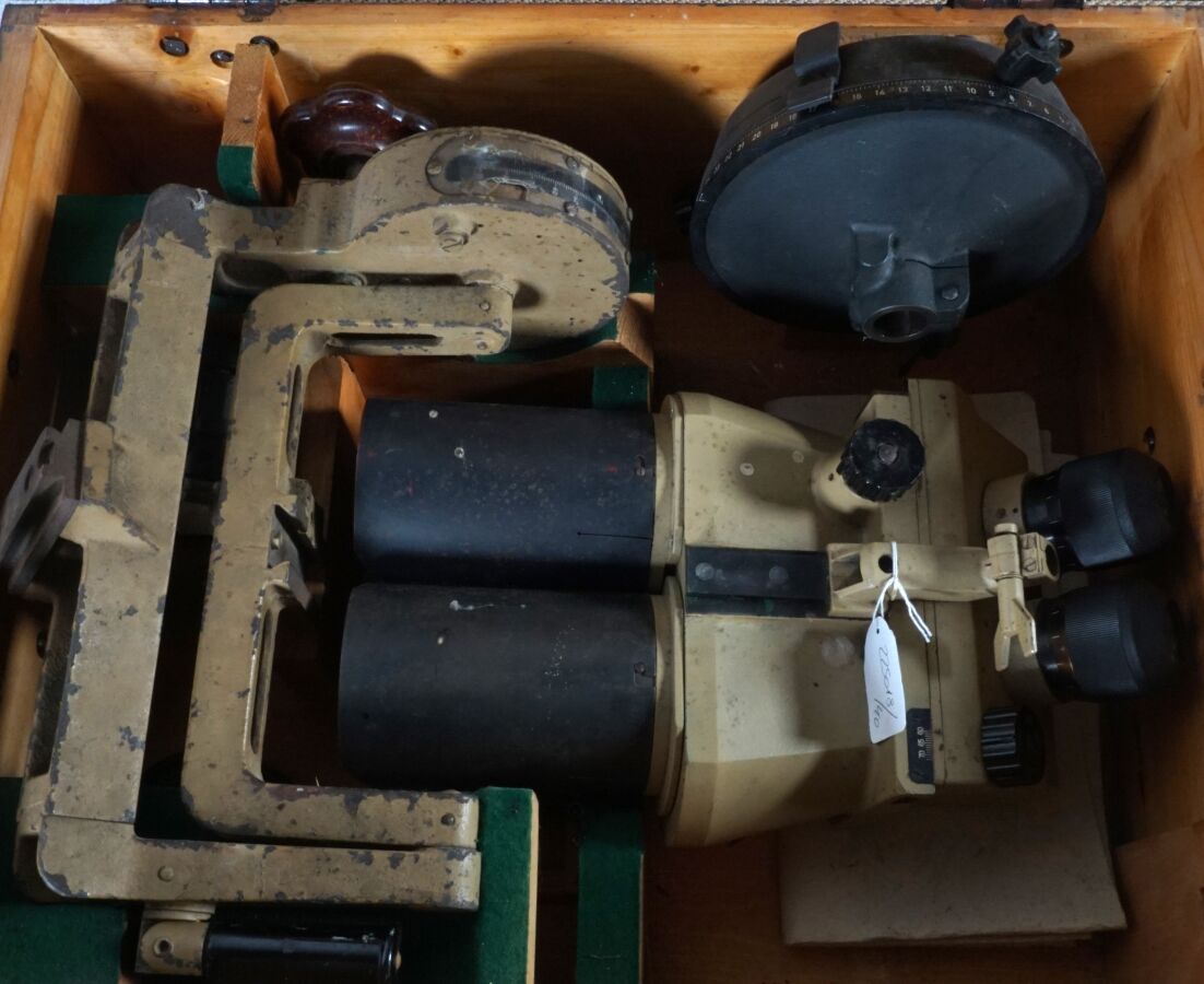 ALLEMAGNE 1933-1945 - PAIRE DE JUMELLES D'OBSERVATION AERIENNE DF 10x80, fabricant DKL, n°44977, optique claire réglable sur différentes positions, en caisse bois marquée " FLAKFERNROHR 10 x 80 " avec accessoires dont bonnette, support, boîte à batterie, câblage et grille de visée, grand trépied métallique, dimensions caisse : 30 x 57 x 46 cm, BE.