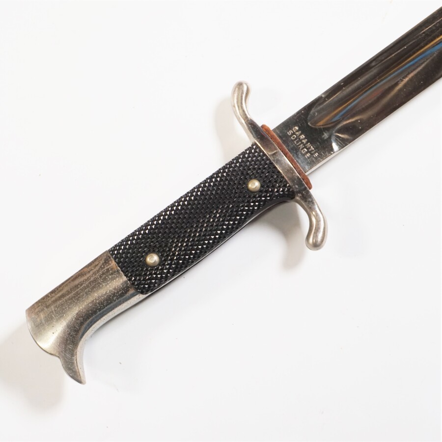 ALLEMAGNE 1933-1945 - POIGNARD DE SORTIE DE SAPEUR-POMPIER, poignée en acier chromé à plaquettes finement quadrillées, pommeau en forme de tête d'aigle, quillons inversés, lame à pans creux marquée au talon " GARANTIE SOLINGEN ", fourreau en acier et PORTE-FOURREAU en cuir noir, BE.