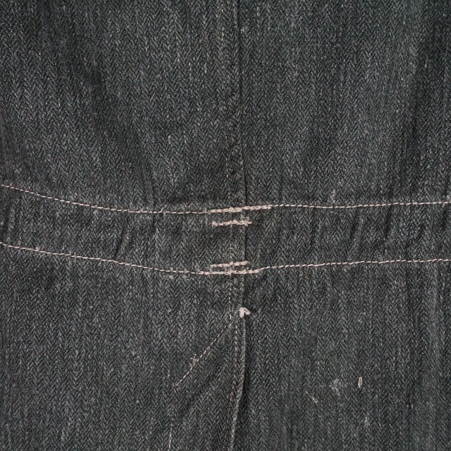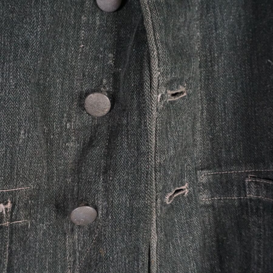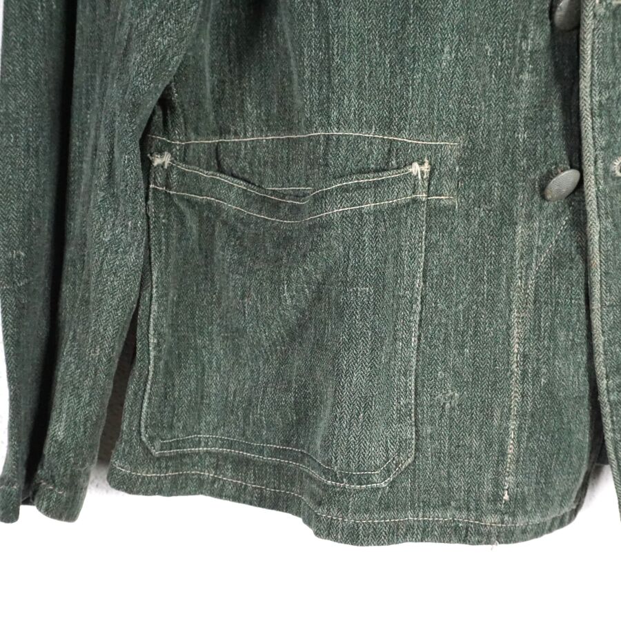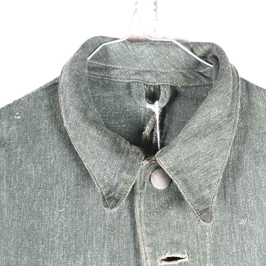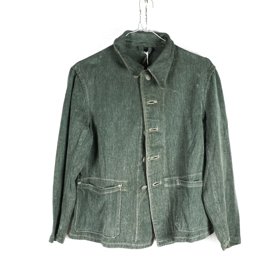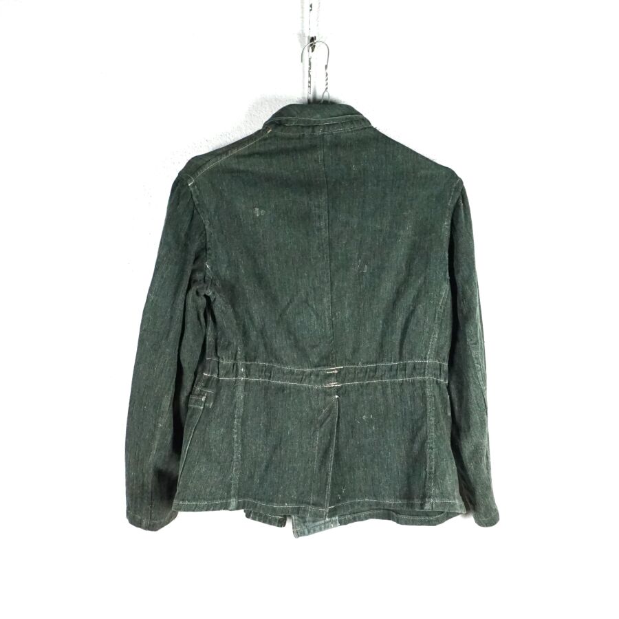 ALLEMAGNE 1933-1945 - VESTE DE TREILLIS DE TENUE DE TRAVAIL - DRILLICHJACKE, en drap verdâtre vert roseau à chevrons fermant à 5 boutons grenus en métal gris, 2 poches dans la partie inférieure, lacet de serrage intérieur au niveau de la taille, petite taille, BE.
