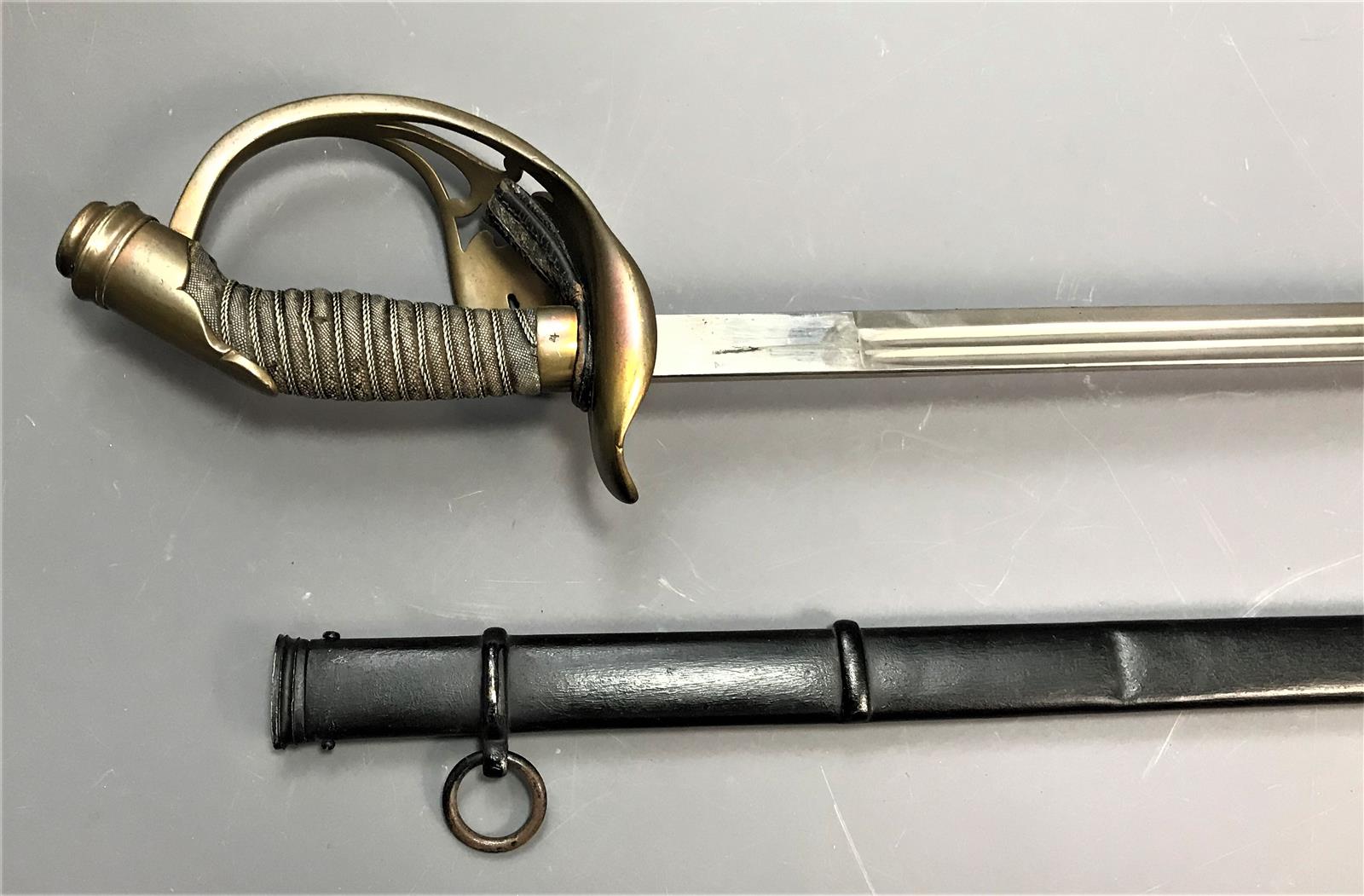 ALLEMAGNE - EMPIRE ALLEMAND - ROYAUME DE PRUSSE - SABRE D'OFFICIER D'INFANTERIE MODELE 1889, monture en laiton trois fines branches à clavier fixe, ouvragée à décor de l'aigle prussien au chiffre de l'Empereur Guillaume II, poignée cannelée gainée de galuchat gris à petits grains au chiffre de Guillaume II, filigranes en fils de laiton torsadés. Lame droite de 74 cm à double gouttières, fourreau en fer laqué noir à un bracelet et anneau de suspente, BE.