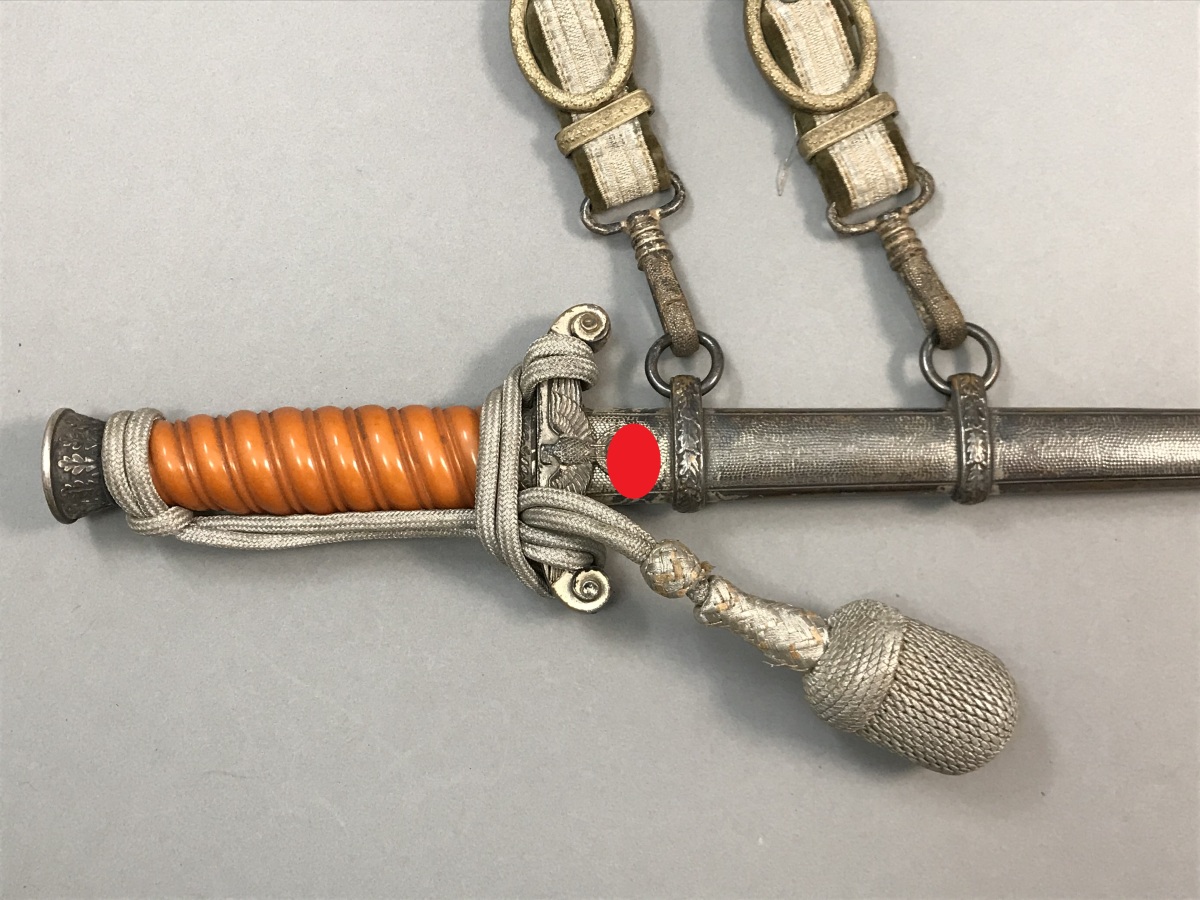 ALLEMAGNE - III REICH - DAGUE D'OFFICIER DE LA HEER MODELE 1935, monture en métal argenté, fusée en matière synthétique orange, croisière à quillons en forme d'ailes, lame droite à double tranchant, talon de la lame au nom et au logo du fabricant " Eckhorn -Solingen ", fourreau en métal argenté à deux bracelets et anneaux de suspente, DRAGONNE en fils d'aluminium tressés et BELIERE DOUBLE sur fond de velours vert, TBE.