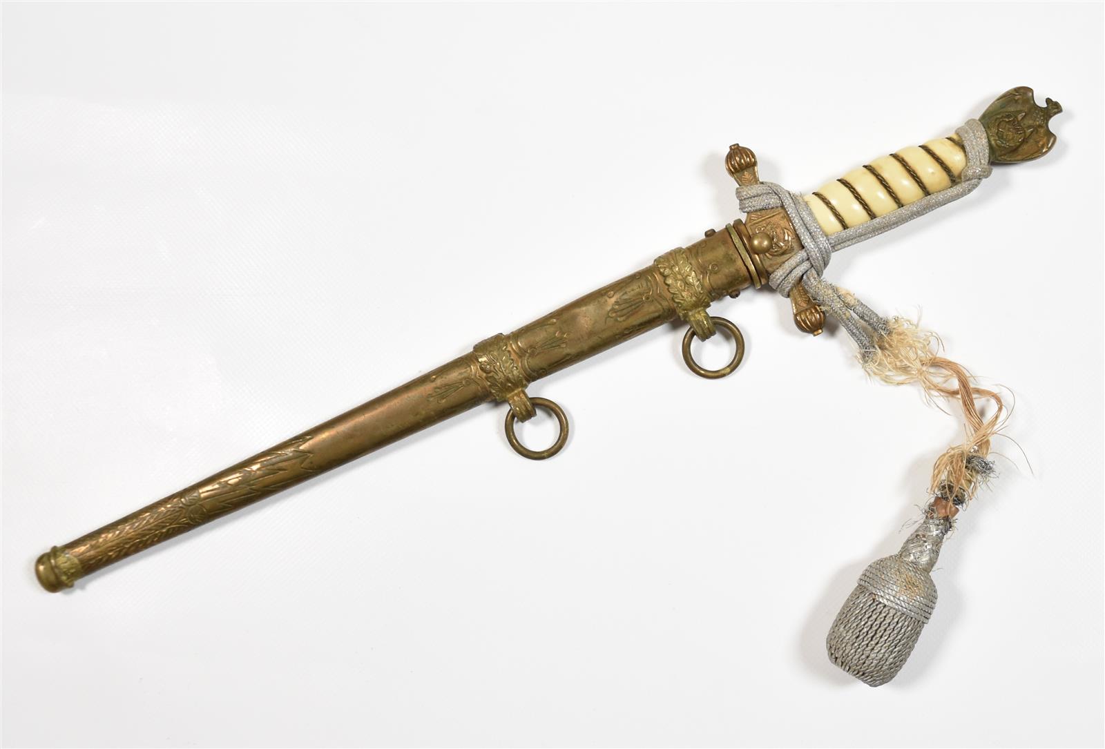 ALLEMAGNE - III REICH - DAGUE D'OFFICIER DE LA KRIEGSMARINE MODELE 1938, monture en laiton ciselé, fusée en bois gainée de matière synthétique blanche imitant l'ivoire avec filigrane de fils de laiton torsadés, lame droite fortement piquée à double gouttière gravée à l'acide, talon de la lame au nom et au logo du fabricant " EICKORN SOLINGEN ", fourreau au modèle à décor gravé d'éclairs à deux bracelets et anneaux de suspente, DRAGONNE en mauvais état, EM.