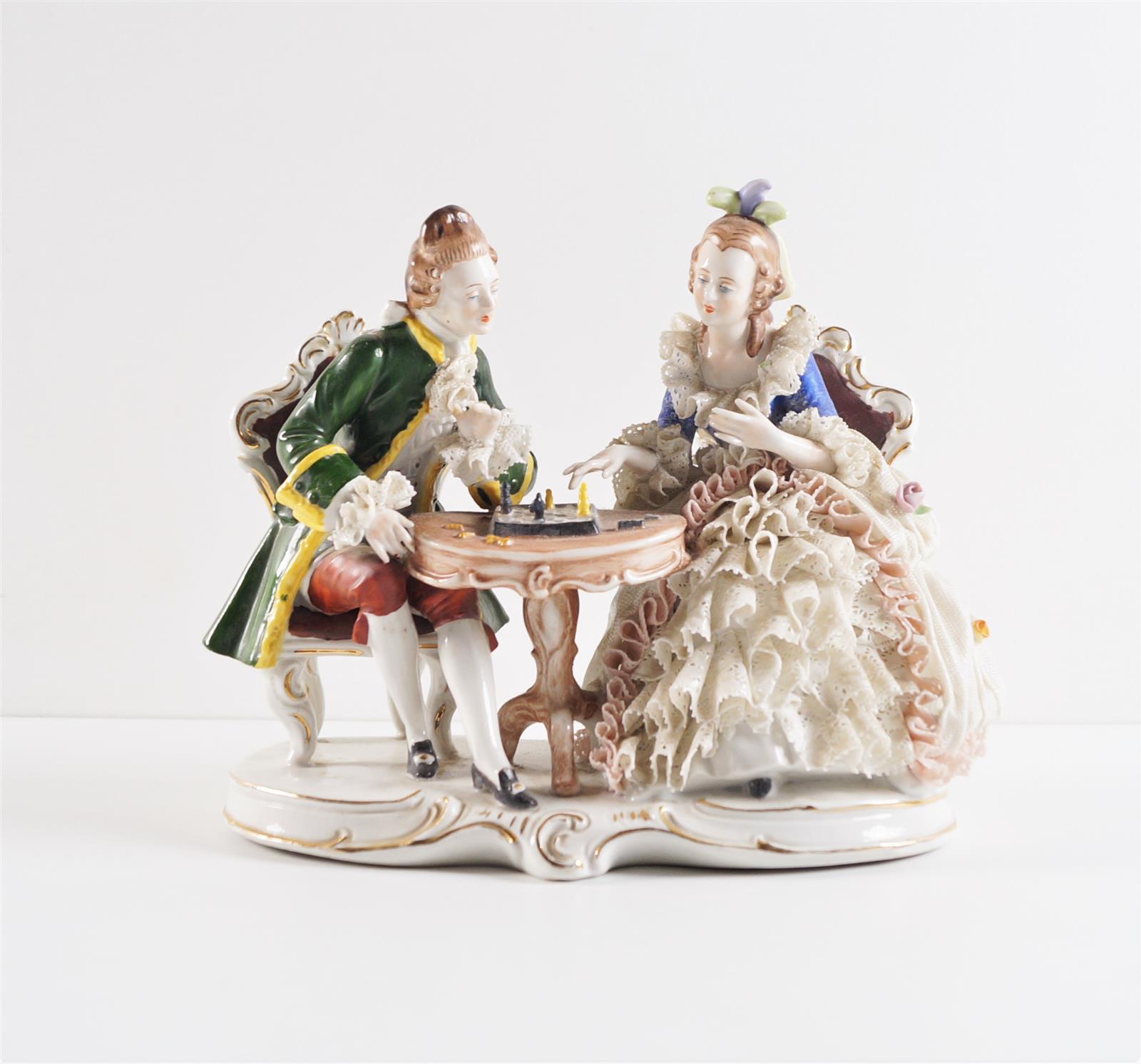 ALLEMAGNE : "Les joueurs d'échecs", sujet en porcelaine polychrome et dorée figurant un couple habillé à la mode du 18e siècle, porte une marque "RP"en rouge sous la base, H. 18 cm., L. 20.5 cm (accidents et manques à la robe).