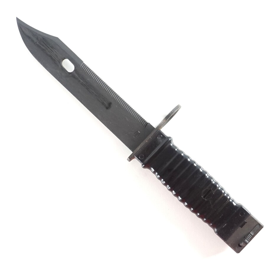 ALLEMAGNE - POIGNARD-BAIONNETTE KCB-M1, pommeau et garde en acier bronzé noir, poignée en matière synthétique striée, lame en acier bronzé noir de type Bowie à dos scie, marquée au talon NWB sous le logo Eickhorn (écureuil très effacé), fourreau en matière synthétique noir à garnitures en métal avec système coupe-barbelés, PORTE-FOURREAU en toile verte, BE/TBE.