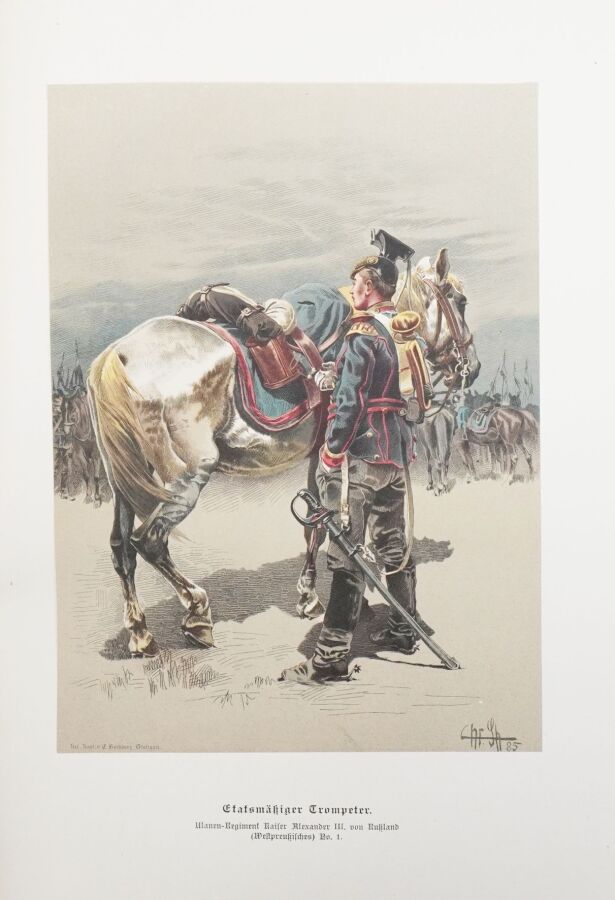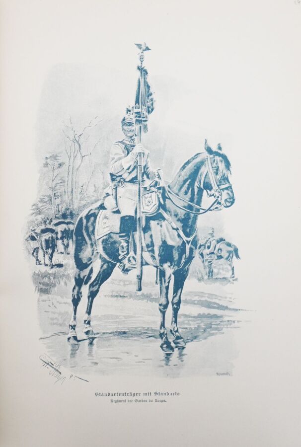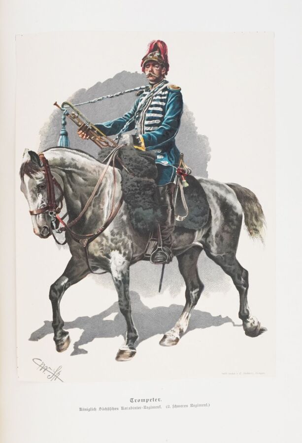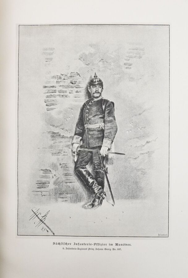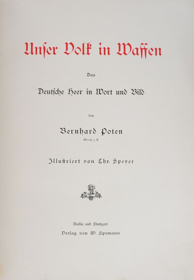 Monumentale étude illustrée par Christian Speyer d'un frontispice et de 52 planches hors texte d'uniformes allemands, dont 46 en similigravure et 5 en chromolithographie, la plupart sous serpentes, ainsi que de nombreuses figures dans le texte en noir et en bistre. Le frontispice offre un beau portrait doré en médaillon du colonel prussien Bernhard von Poten (1828-1909).