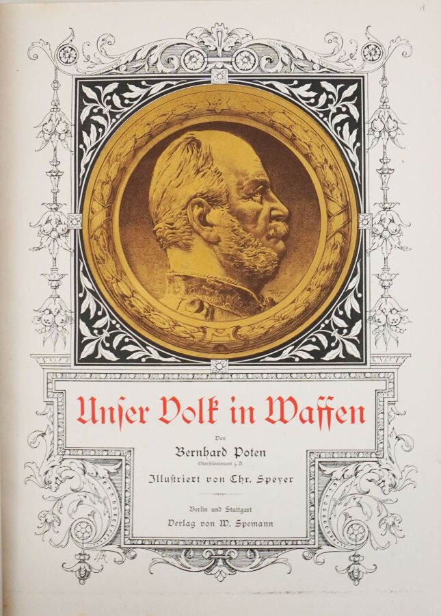 Allemagne - POTEN (Bernhard von). Unser Volk in Waffen. Das Deutsche Heer in Wort und Bild. Berlin & Stuttgart, Spermann, [1885-1887]. Fort in-folio (396 x 290 mm) de XI pp., 1 f. n. ch., 385 pp., 3 ff. n. ch. intercalés entre les pp. 308-309. Veau fauve marbré, dos à nerfs orné, pièces de titre et de date en chagrin rouge, chiffre doré en pied, plats encadrés d'une large frise et de filets dorés avec petits fleurons d'angle, roulette sur les coupes et sur les chasses, tête dorée, non rogné, couverture de livraison conservée (Lachambre relieur).