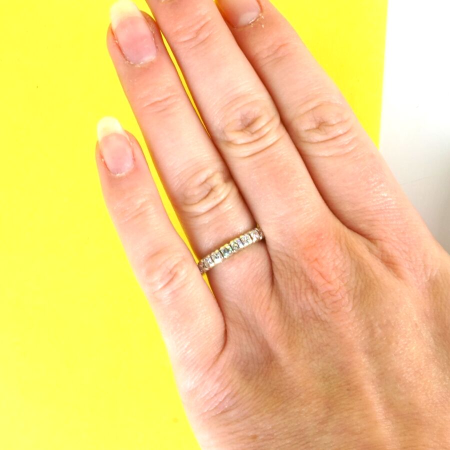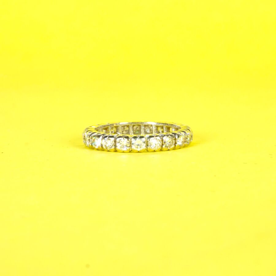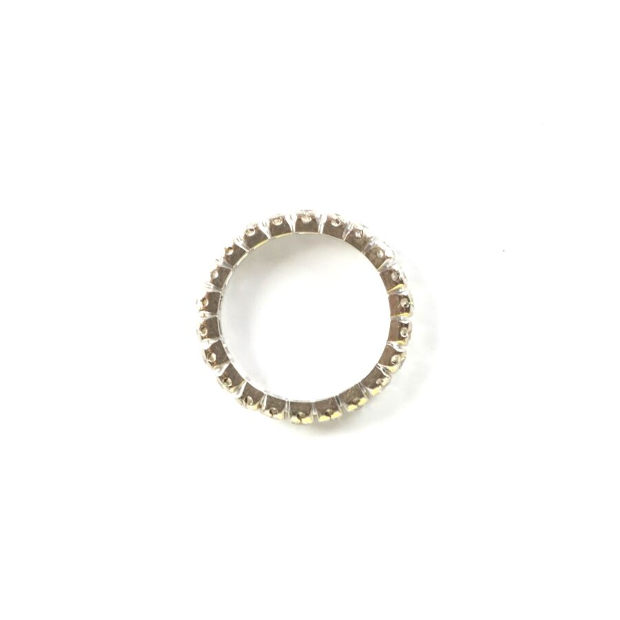 Alliance américaine en or gris 18K (750/oo) sertie de 22 diamants taille brillant calibrant 0.03 cts chaque, TDD. 51. Larg. 3 mm. Poids brut : 3.1 g environ.