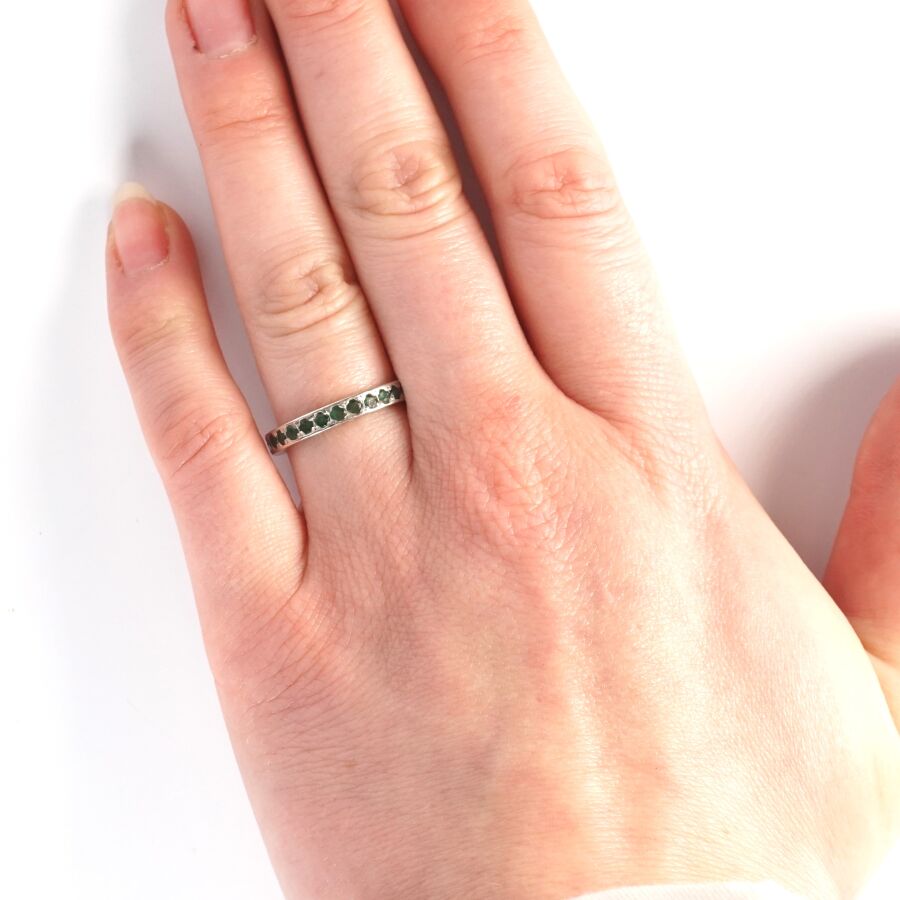Alliance américaine en platine (850/oo), agrémentée de petites pierres vertes calibrant 0.02 ct chaque environ, probablement des émeraudes, TDD. 54. Poids brut : 3.5 g environ (petites rayures).