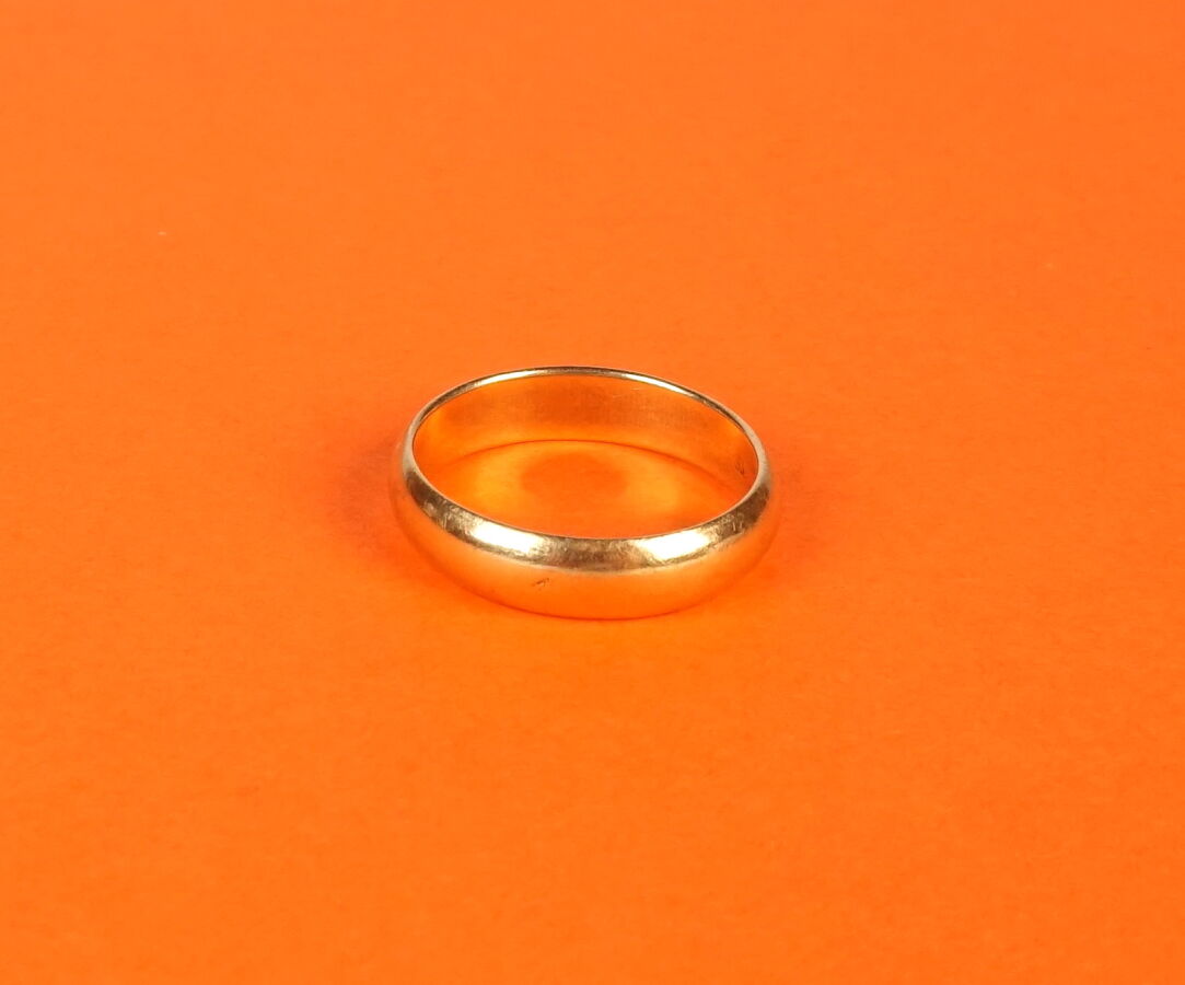 Alliance en or 18K (750/oo), formant un large jonc bombé, non gravée, Lar. 5 mm. TDD 56. Poids brut : 4.9 g environ.