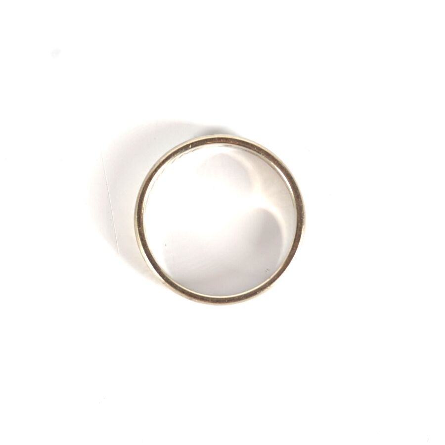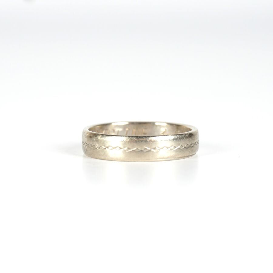 Alliance en or gris 18K (750/oo), à décor ciselé, inscriptions à l'intérieur, TDD. 50/50.5. Larg. 4 mm. Poids brut : 3.2 g environ.