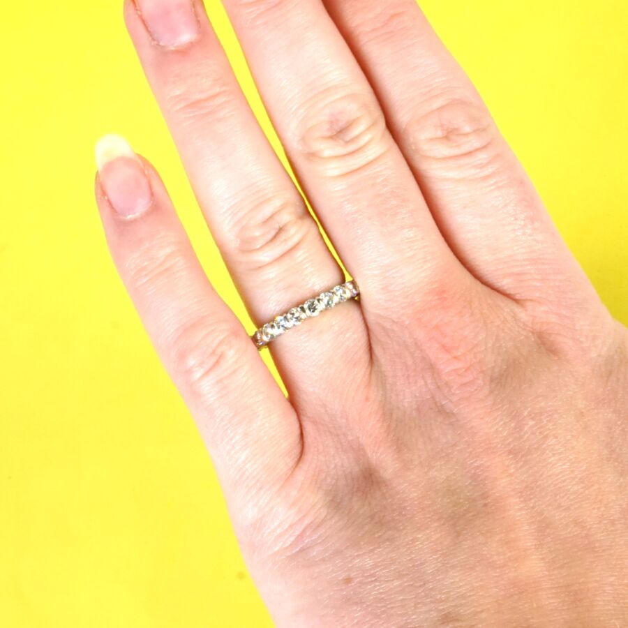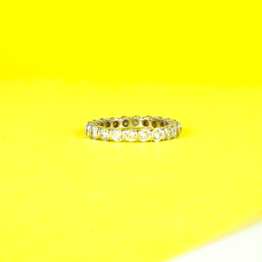 Alliance rivière dite américaine en platine (850/oo) sertie de 22 diamants taille brillant calibrant 0.23 cts chaque (D. 3 mm), soit 2.3/2.4 cts au total environ, TDD. 51. Larg. 3 mm. Poids brut : 4 g environ.