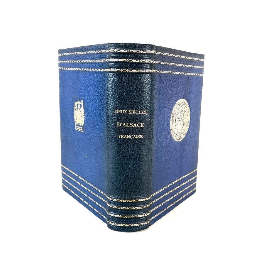 [ALSACE] - [COLLECTIF] - Deux siècles d'Alsace française 1646-1798-1848 - Strasbourg, Paris ; Éditions F.-X. Le Roux & Cie, 1948 - 1 fort volume In-8° - 22 planches de reproductions photographiques de médailles hors texte - Reliure de l'époque maroquin bleu - Roulette dorée aux plats et au dos, médaillon central doré au 1er plat reprenant l'illustration de la 1ère de couverture conservée, marque dorée de l'éditeur au 2nd plat - Contre plats et gardes doublés de moire blanche - Dos à nerfs titré or (légèrement assombri) - Tête dorée - Très bon exemplaire nominatif : " A Monsieur Vincent Auriol Président de la République Française. Hommage très respectueux. "