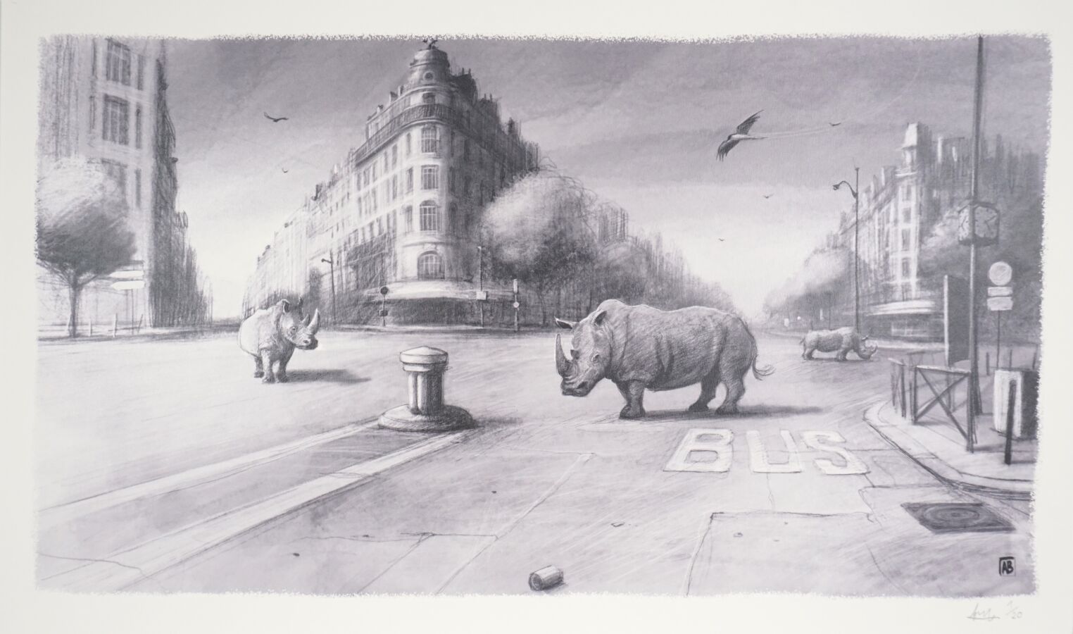 Amaury BRUMAULD (XX-XXIe), "Les rhinocéros", impression Fine Art édition limitée 20 exemplaires, signée et numérotée 1/20 en bas à droite, 36 x 50 cm.