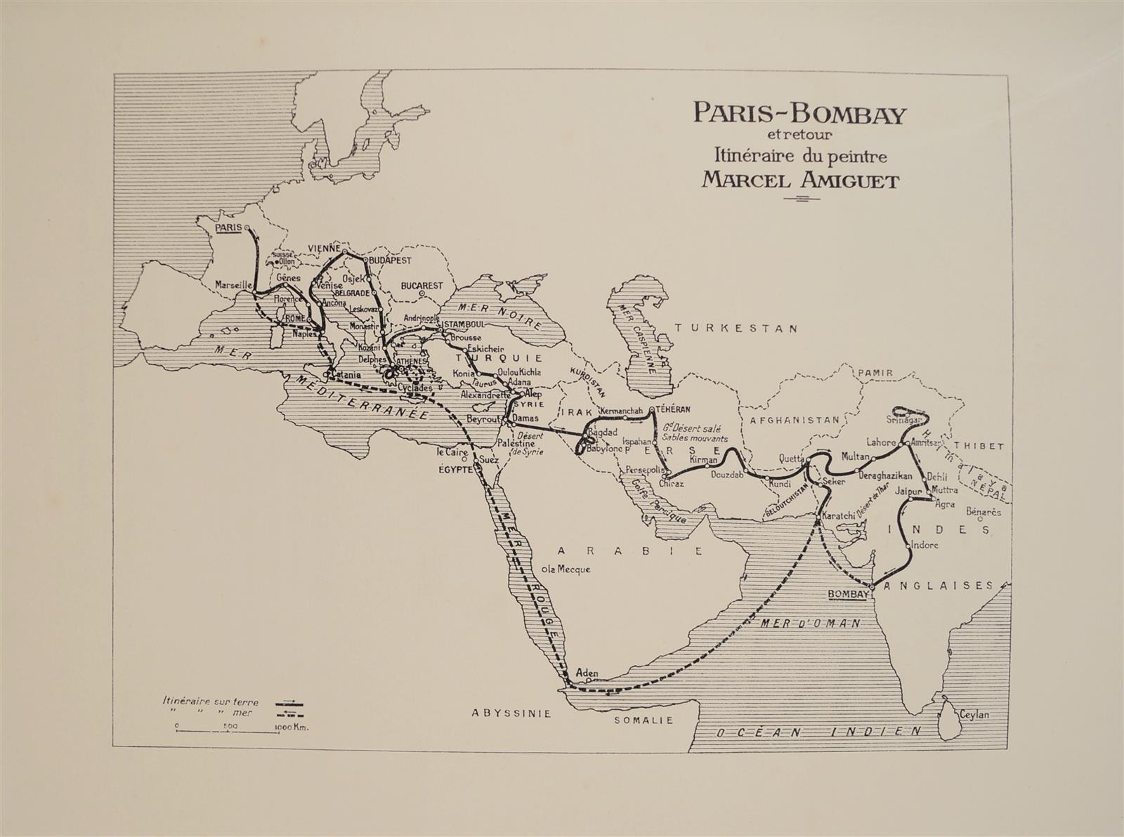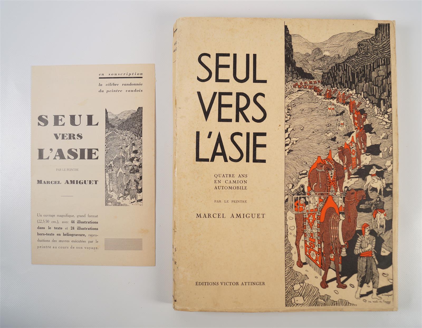 AMIGUET (Marcel) - Seul vers l'Asie. Quatre ans en camion automobile - Paris, Neuchâtel ; Editions Victor Attinger, 1934 - 1 volume In-4° broché (fente discrètement recollée au 1er mors) - Portrait frontispice, 52 dessins en noir, 1 carte et 25 illustrations en héliogravures de l'auteur, dont contrecollés in et hors-texte - Bon exemplaire auquel est joint le bon In-12° de souscription de 4 pages - Mention janvier 1935 signée Y à la page de titre à l'encre noire.