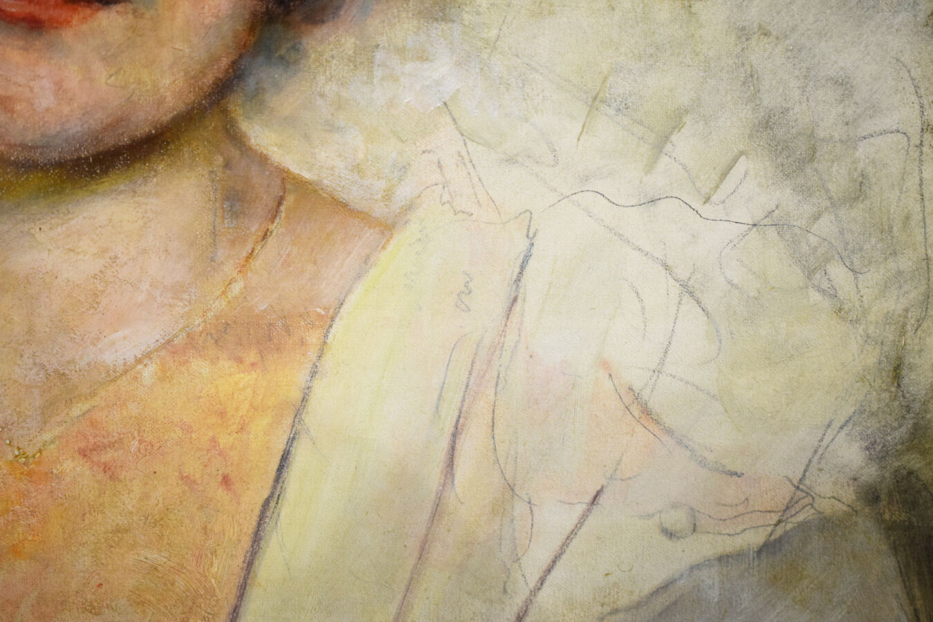 La datation du portrait s'inscrit clairement dans la période parisienne de l'artiste, entre 1930 et 1932, avant son retour en Inde. Le modèle, représenté en buste, est assis de face sur une banquette, le corps légèrement tourné vers la gauche. Son regard se pose sur le spectateur, contribuant au caractère introspectif et délicatement intime de la scène. Le dessin demeure perceptible et la touche, volontairement vaporeuse, confère à l'ensemble une atmosphère de douceur et de retenue.
